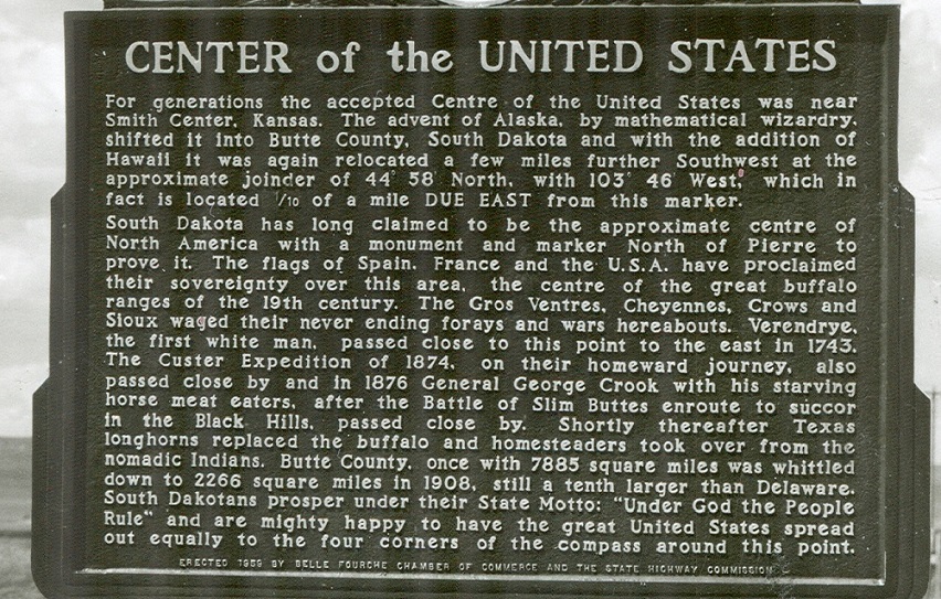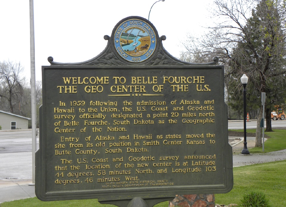 The designation for Belle Fourche as being at the Geographical Center of the United States came in 1959, just one year after Castle Rock had received the same designation. The shift from the Castle Rock position to the Belle Fourche position was only 6.64 miles to the west, but many felt the location would be better designated as being at Belle Fourche since Castle Rock was already becoming a ghost town. The new location came as a result of the addition of Hawaii as a state. The designation at Castle Rock had come with the addition of Alaska in 1958 which prompted the major shift from the long-held location at Lebanon, Kansas. This shift was not made without a considerable amount of protest by those in Kansas, so the monument at Lebanon continues to bear the name as the geographical center of the "Continental United States".