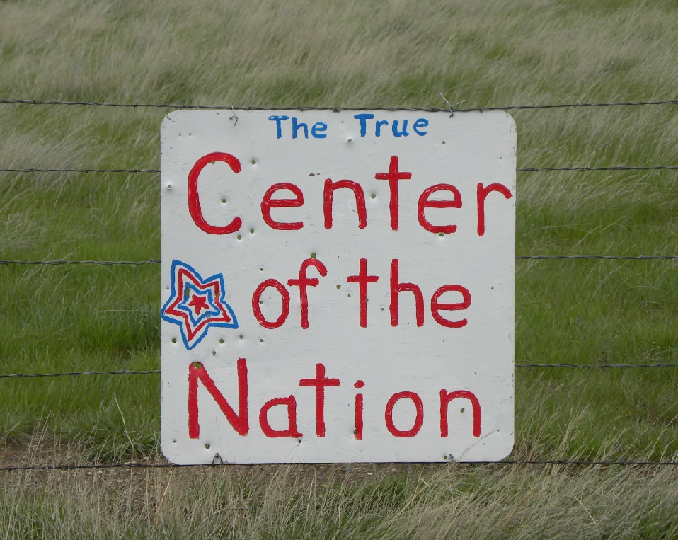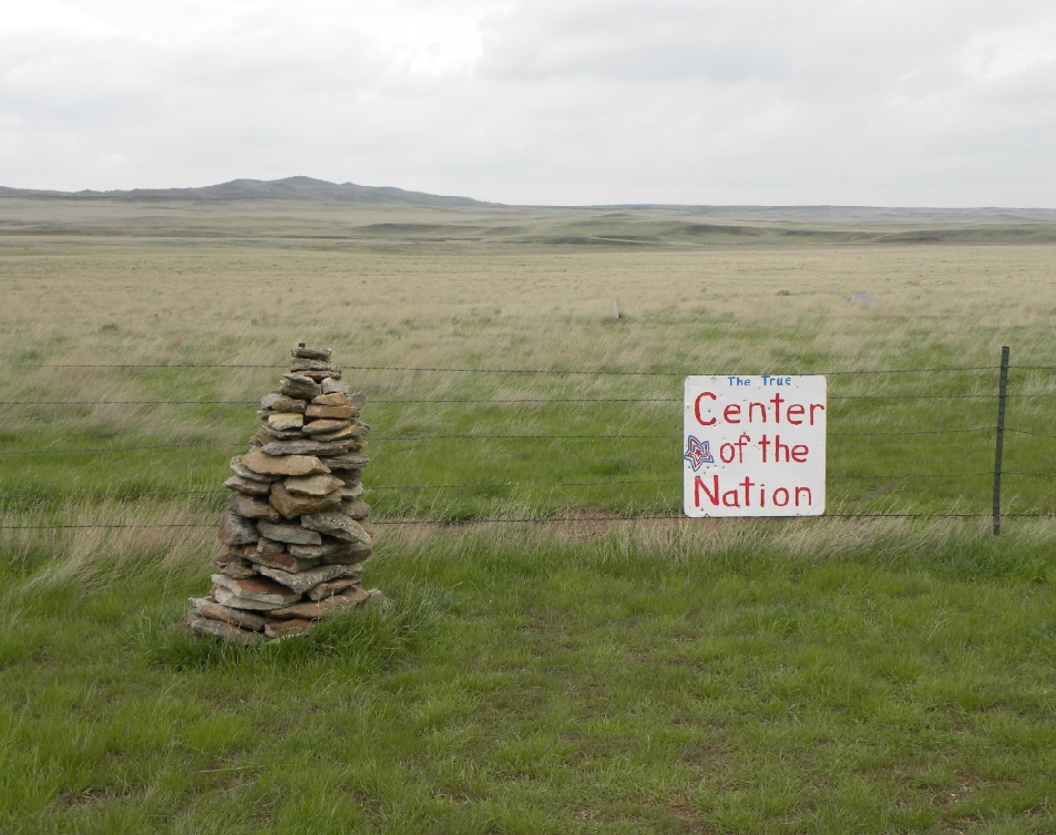 A mound of stones (often mistaken for the center monument) and a sign at the true geographical center location.