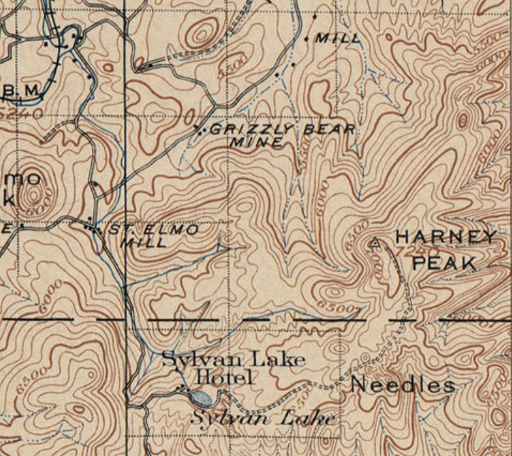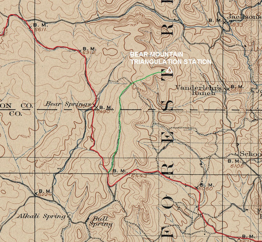 The red line shows the road used by the 1897 leveling crews along which bench marks were placed. The green line shows where the crew most likely ran a spur line to the Bear Mountain triangulation station. Once an elevation was established upon this point, a vertical angle was made to the triangulation station on Harney Peak. - USGS 1901 "Harney Peak" quad.