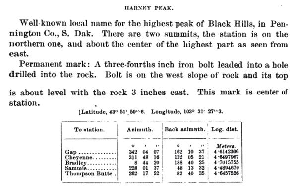 Text from the 1893 triangulation survey when a point was established on Harney Peak.