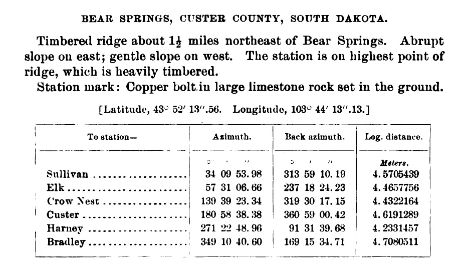 "Bear Springs" was the name of the triangulation station on Bear Mountain from which the vertical angle was likely made to Harney Peak in 1897.