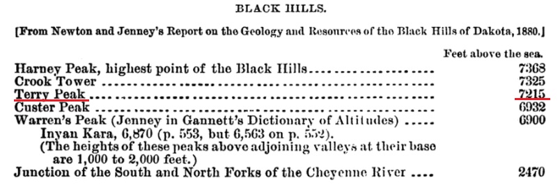 In 1893, USGS surveyed parts of the Black Hills in order to produce topographical maps. The first map of the Harney Peak area was published in 1896 and was named "Harney Peak". The scale was 1:125,000 and this map was known as a 30-minute quadrangle sheet since the perimeter of the map or "quad" was bounded by 30 minutes of latitude and 30 minutes of longitude. This became the first accurate map of the area. The elevation noted on the quad at Harney Peak was 7215'. A perplexing question remains as to how this elevation was derived. Was it through triangulation using an assumed vertical datum or was this a mistake? As previously mentioned, Bulletin No. 72 of the U. S. Geological Survey in 1891 listed Harney Peak as 7368' which was Tuttle's determination. Ironically, the same publication listed Terry Peak as 7215' which was the same elevation that was placed on the 1896 quad for Harney Peak. Was an error made by mistakenly placing the elevation for Terry Peak on the map for Harney Peak? There seems to be strong evidence that this might have been the case. If this was a mistake, it had to have been one of the more notorious mistakes of USGS in that era.