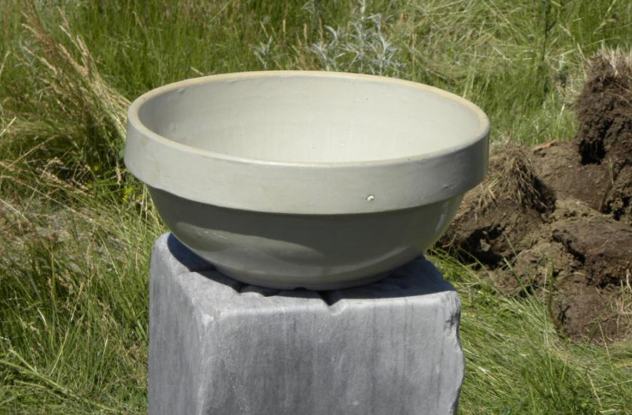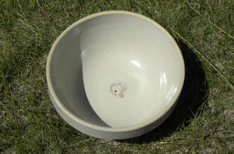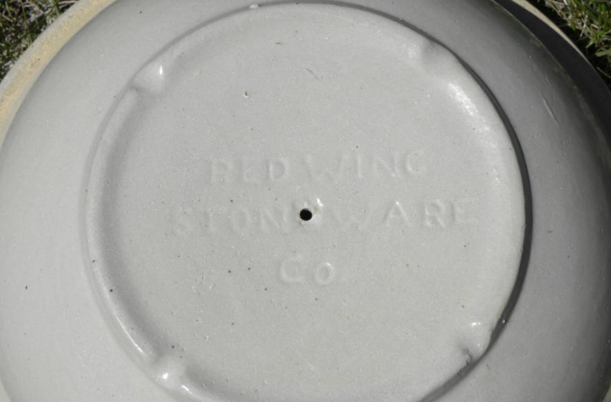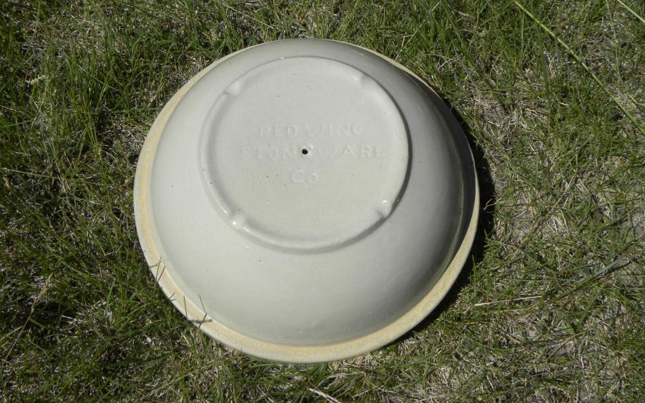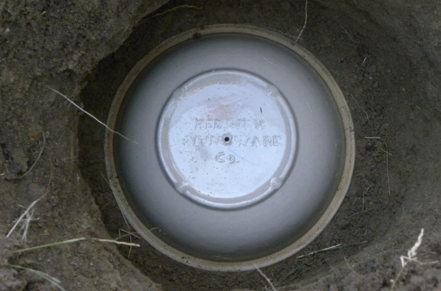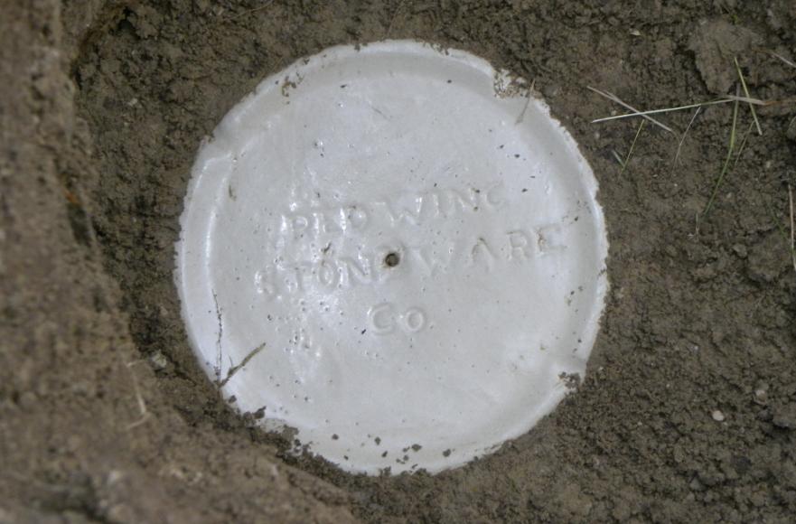 The marble post measured 30 3/4" in length and was 8 inches square. Luck was on our side as we soon uncovered the top of the lower monument just 1.8' below the ground surface which was described by C&GS as an earthenware crock. Uncovering the lower monument revealed it was made by the "REDWING STONEWARE CO.". At first is appeared to be a smaller diameter crock, but more excavation revealed it was actually a large stoneware bowl. The drill hole was found in the center as noted by C&GS.We then tied out the drill hole before removing the bowl. It was 0.32' north and 0.12' west of where we had previously tied out the top of the marble post. The inside of the bowl was chipped out where the drill bit had come through from the other side. The bowl measured 10 1/2" outside diameter and 9 3/4" inside diameter. It was 4 1/2" tall.