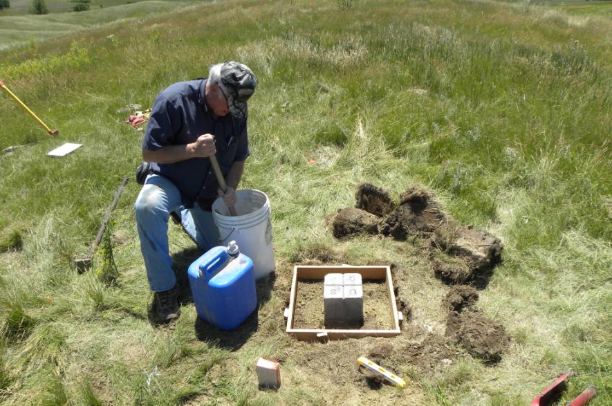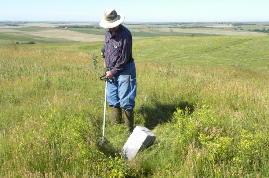 We met the landowner, Arnold Moody, at his farm, who then took us to the site along with his sister, Donita, and her husband John. In previous years, cattle had congregated around the monument and probably used it as a rubbing post. This exposed more than half of the 8-inch square marble post which was found leaning. Vehicles have also accidentally struck the monument when hunters sought the high hill for a vantage point to view the surrounding countryside.Upon arriving at the location, the hill was covered with tall brome grass, sweet clover, and other pasture grasses. Arnold used a weed trimmer to first take down the vegetation around the monument so we would have a nice area to work. The first task involved uprighting and plumbing the monument to where we thought it should be in its correct horizontal position. With level and rod, we then obtained the height of the monument. Tie nails were set in two directions 5 feet away in case there was no lower monument. Arnold remembered hearing a story that when some of his ancestors who were young boys, they once brought home a survey monument to show their father who promptly made them take it back. Was this the same monument as the one we were seeking? No one knew for sure, but if it wasn't in the same location as set by USC&GS in 1900, we would have a problem and probably not be able to find the lower monument without later having to do some precision GPS work to pinpoint the exact location.