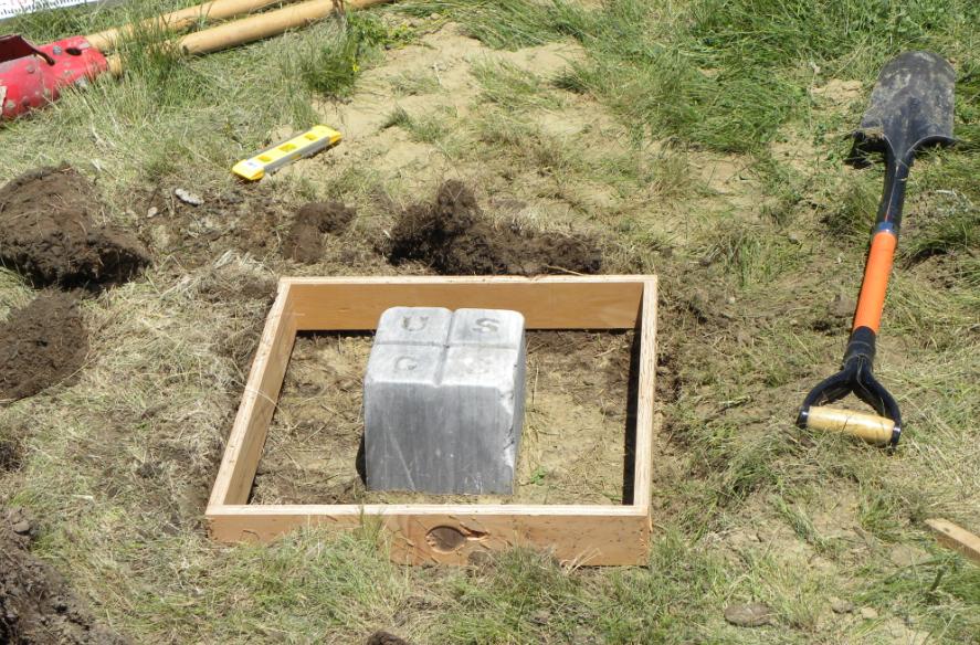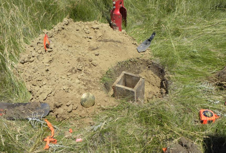 At the location of the copper nail, we set a 6" square x 36" tall box into the ground, filled it with concrete, and set a 3" brass disk in the top to mark the location. The entire remonumentation project took around 6 hours to complete.