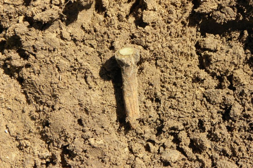 Again, luck was on our side when the metal detector found the copper nail which was still encased in a small piece of wood. A slight discoloration in the soil showed us where the remaining portion of the pine stub had been. A measurement with the EDM then showed the distance between the marble post triangulation station and the copper nail magnetic station to be 109.38', or just 0.02' from where it was stated to be.