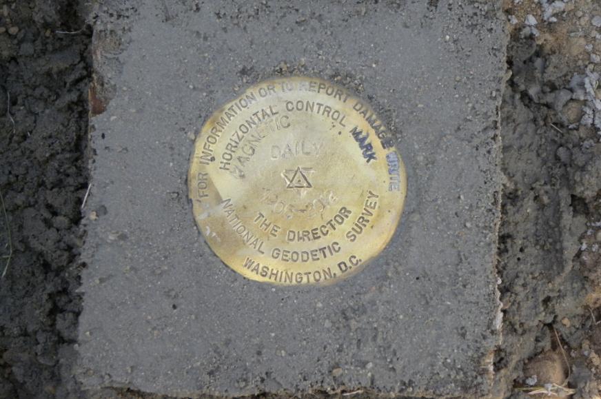 The brass disk that replaced the copper nail. Stamped "DAILY 1906-2012".