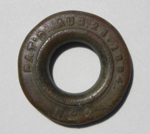 Another nice find with the metal detector was a brass grommet with a patent date of Aug. 26, 1884. This was found near the magnetic station location and was probably from a canvas tarp or tent used by the survey crew at that location. We were also able to discern the old ruts where the trail road used to be located as noted in the 1900 description.