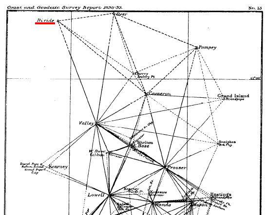 Triangulation station DIVIDE is a primary horizontal control point on the 98th Meridian Survey that passed through Nebraska between 1898 and 1901. The original description by USC&GS said it was located on the summit of a prominent hill one mile south of the town of Divide. The post office for this town was discontinued in 1906 and it quickly vanished from existence. Today the location is approximately 10 miles southwest of Loup City.