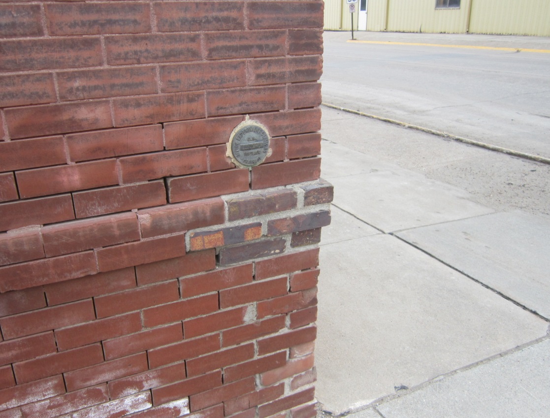This bench mark is located the northwest corner of 4th & Main Streets in Pender. The cap is set into the brick face of the former bank building which is now being used as the Palace Hotel. Photo credits to Gene Thomsen taken on March 18, 2014.