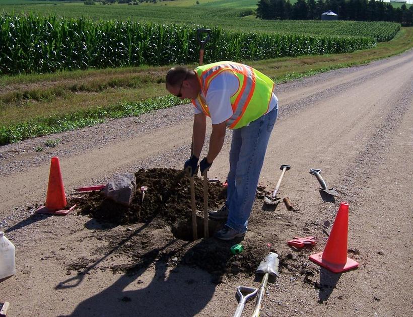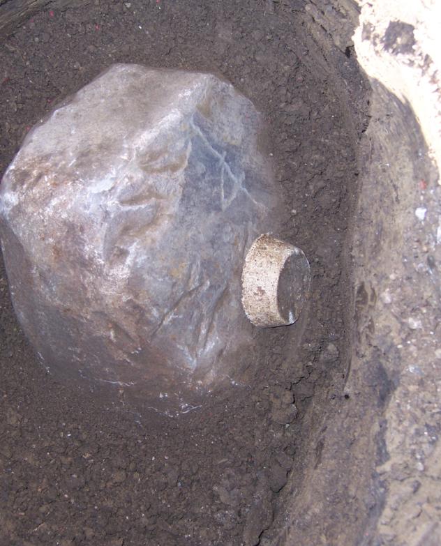 This excavated original GLO monument was marked with the chiseled ¼ indicating it to be a quarter corner. John B. Gridley noted it as being a Granite measuring 12"x8"x7". Field measurements taken on the date of excavation placed the size at 14"x10"x9". Nebraska Deputy State Surveyor Hugh Dillon found the stone in 1937 (80 years after its placement) and placed a concrete memorial next to it.