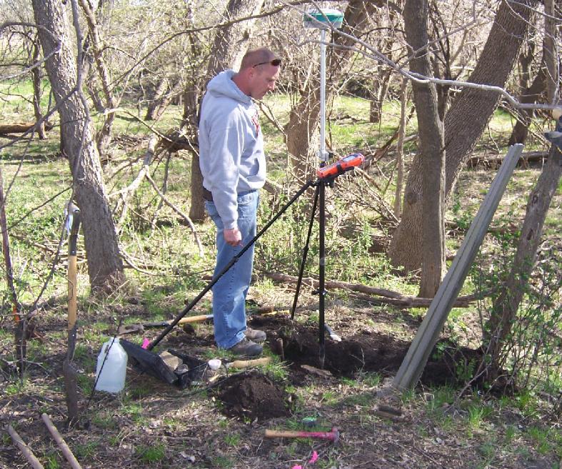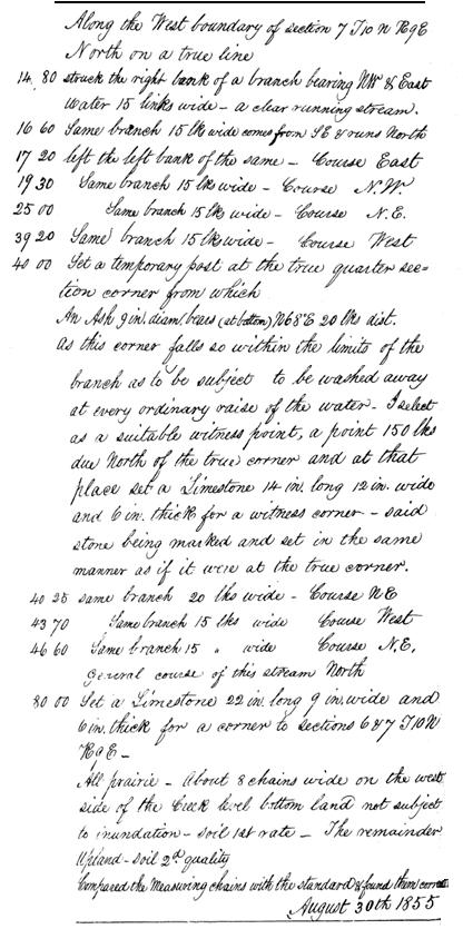 This original GLO monument was established as a witness corner to the quarter corner which fell in the creek area. The limestone originally measured 14"x12"x6" and was marked as a witness corner. It was placed 150 links (99.00') on line and north of where the actual quarter corner landed in the creek. Upon discovery of this stone, it was found to have been broken off. The bottom portion of 5" was still intact and the width and thickness matched the priginal dimensions. The creek still resides in the same location today, 155 years later.