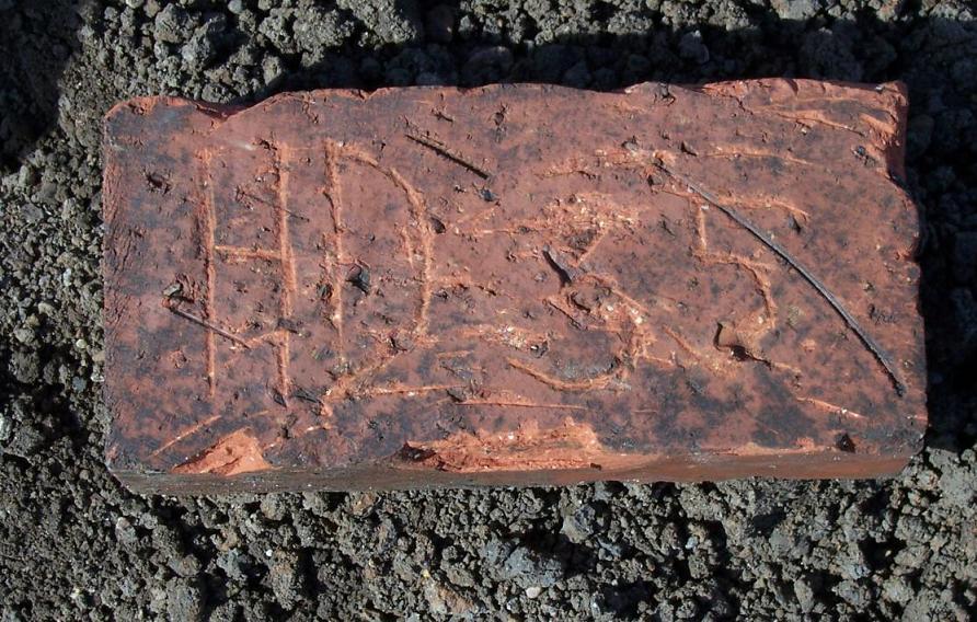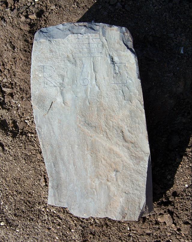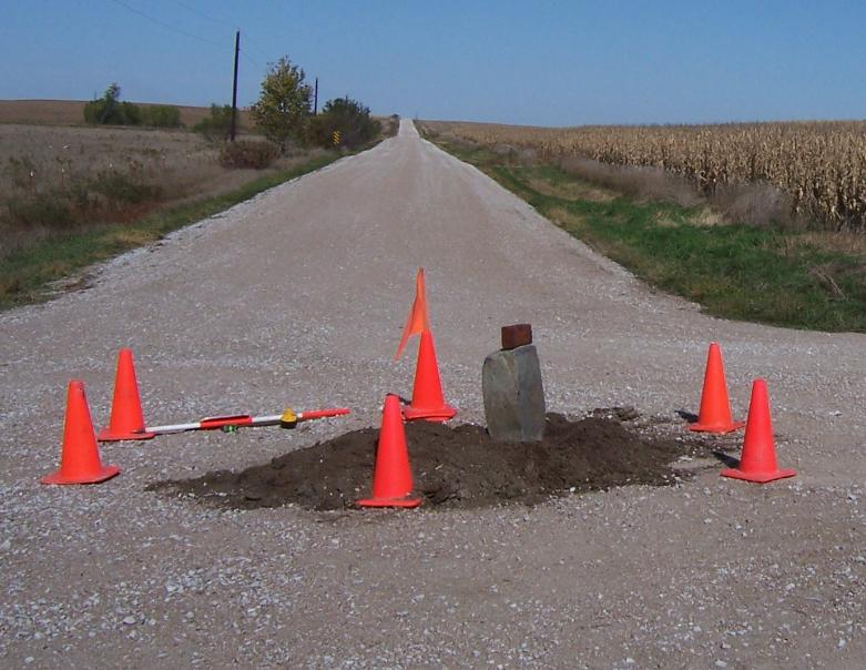 An excellent example of an original township corner marked on all four sides with hash marks, letters, and numerals. This monument represents the corner common to Townships 6 & 7 North, and Ranges 5 & 6 East. Jonathan P. Jones stated in his notes that he set a Sandstone 18"x10"x8". Field measurements on the day of excavation found it to be 19"x9"x8". The location is on the Gage/Lancaster County line one-half mile west and one mile south of Hallam, Nebraska. Also found was a red brick marked "HD35" which was placed by Deputy State Surveyor Hugh Dillon as a memorial.