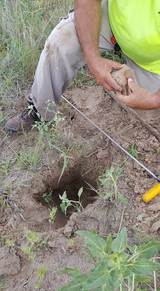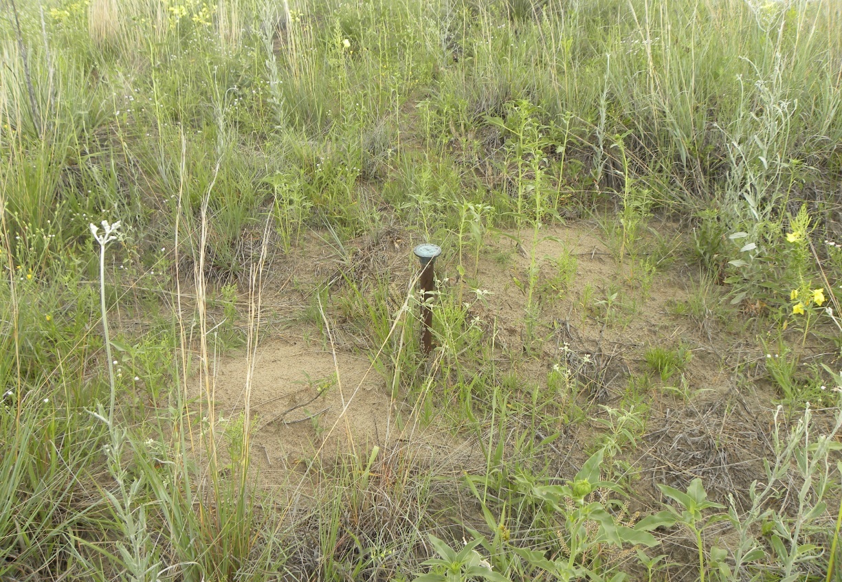 Monument was found out in the open hills approx. 1/2 mile east of the forested area. The pipe was exposed about 12" and leaning. The monument was plumbed up in all directions and then reference nails were set before excavation. A mass of irregular concrete about the size of a grapefruit was found at the bottom of the pipe with part of the concrete forming around the pipe. The pipe measured 36" in length and was 1" outside diameter. The monument was lowered and the concrete placed at the bottom as found. Extra sand was packed around the top. The pits were not searched for since this monument is on the slope of a hill and any further digging would create erosion later.