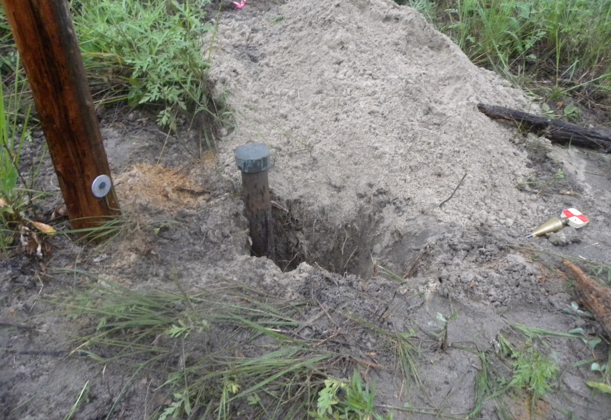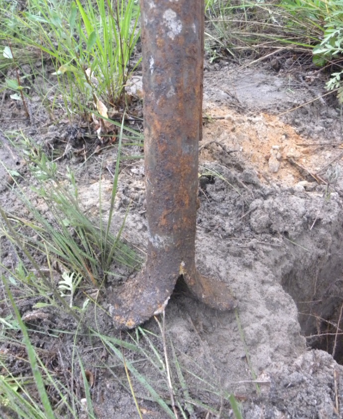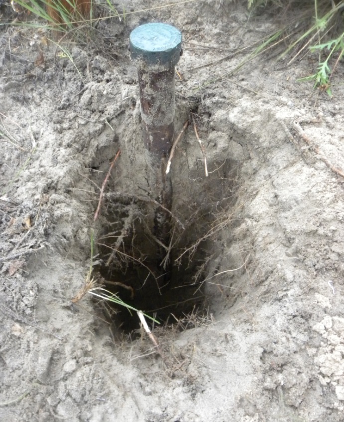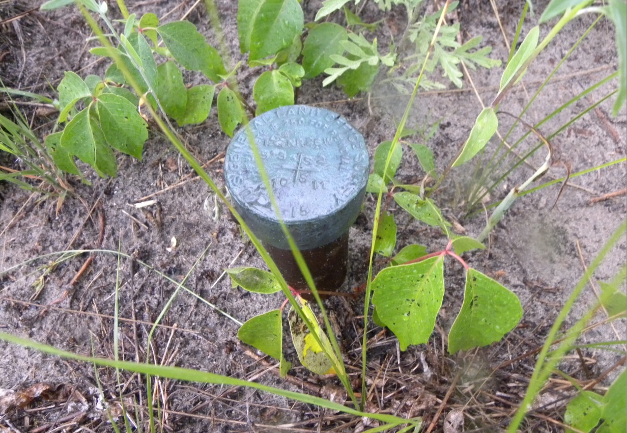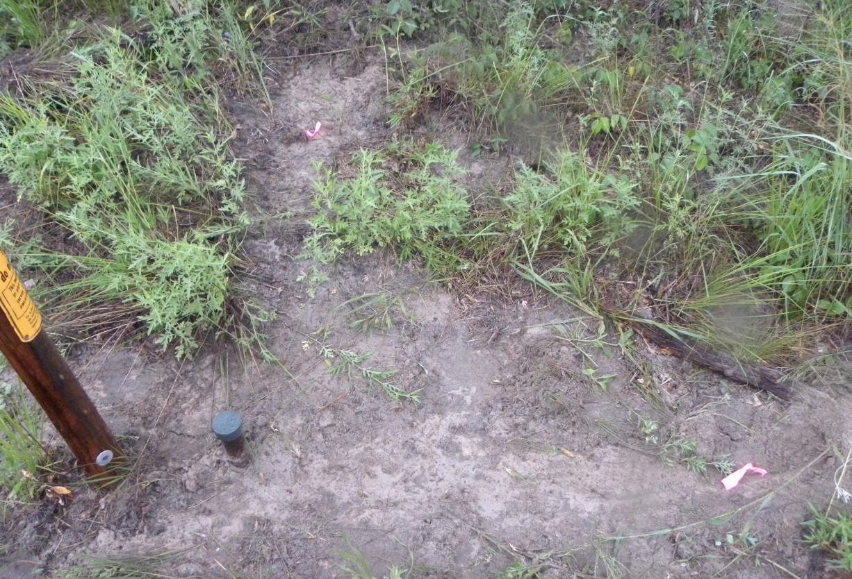 Monument was found in very good condition. Set reference nails and removed the pipe which measured 35" from bottom of flange to top of cap. The spread of the flange was 5" wide with each flange being 3" wide. The pipe was 1 7/8" outside diameter. Bronze cap was 2.5" diameter and 1" tall. Found two small pieces of concrete. One was 3.5"x1.5" and the other was 1.5"x0.75". Replaced pipe as found from reference tie nails. Placed the concrete pieces on the north side of the pipe approx. 0.5' deep. Looked for the NE pit and found discolored soil as shown in the image.