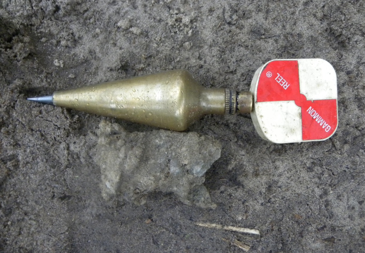 The largest piece of concrete memorial found compared to a 16 oz. plumb bob.