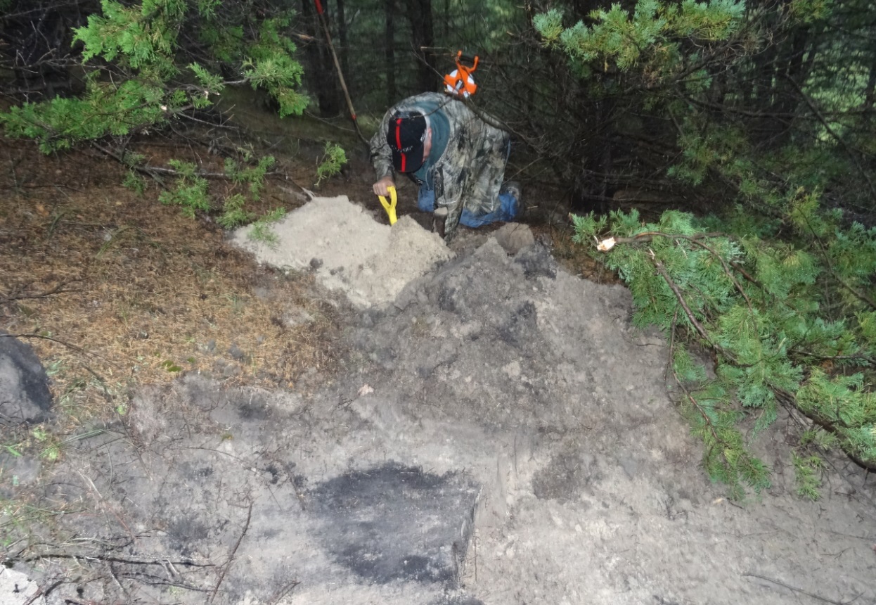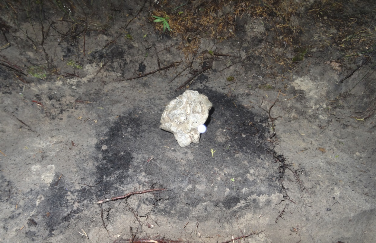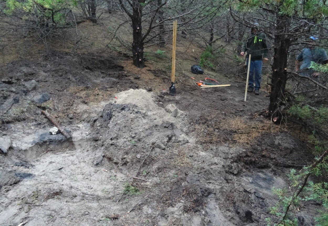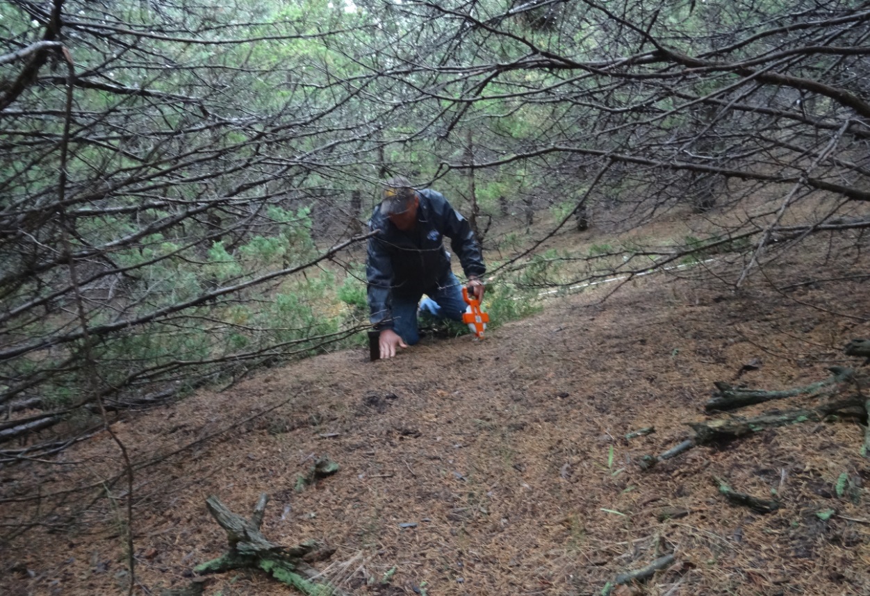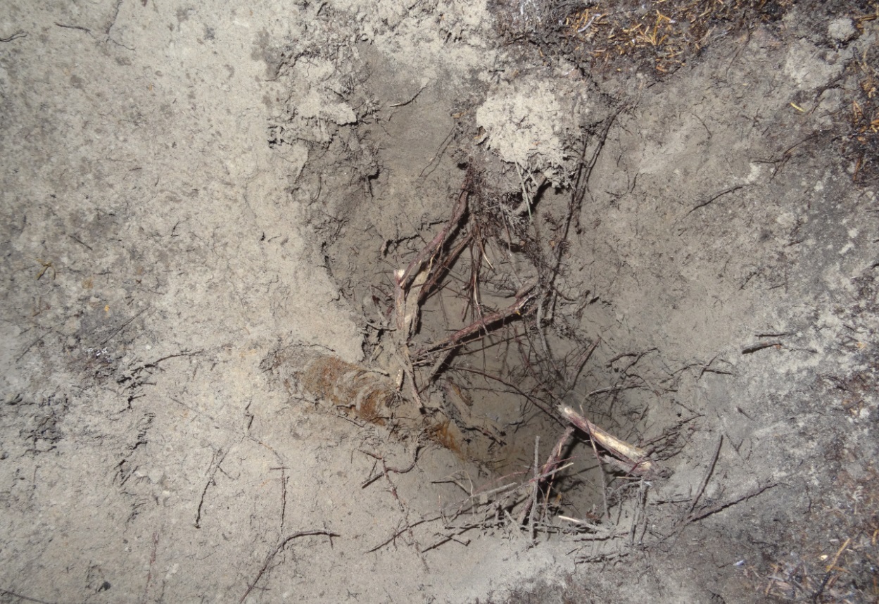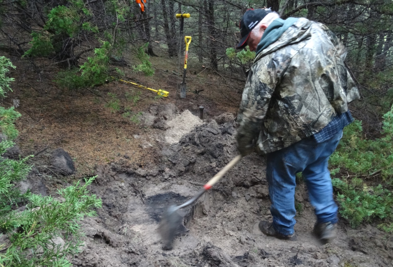 Found a standard GLO brass cap and iron pipe on the north slope of a hill under cedar trees. Tied out the corner and removed the pipe where we found a chunk of concrete about the size of a softball. Replaced the pipe and concrete in their original position and shaved for the pits. Found all four pits which were approximately 18 inches square. We drove a 5/8” rebar in center of each pit.