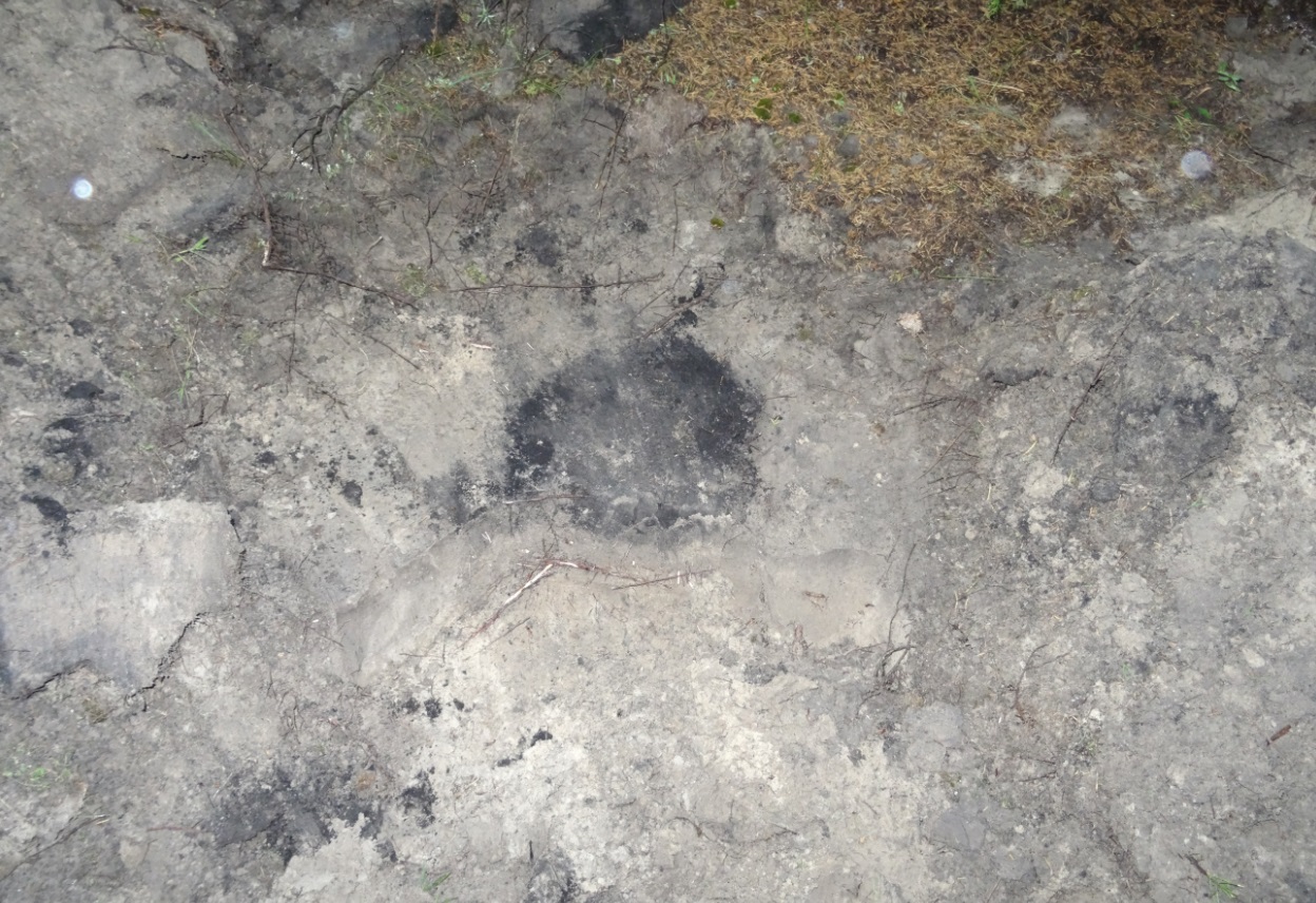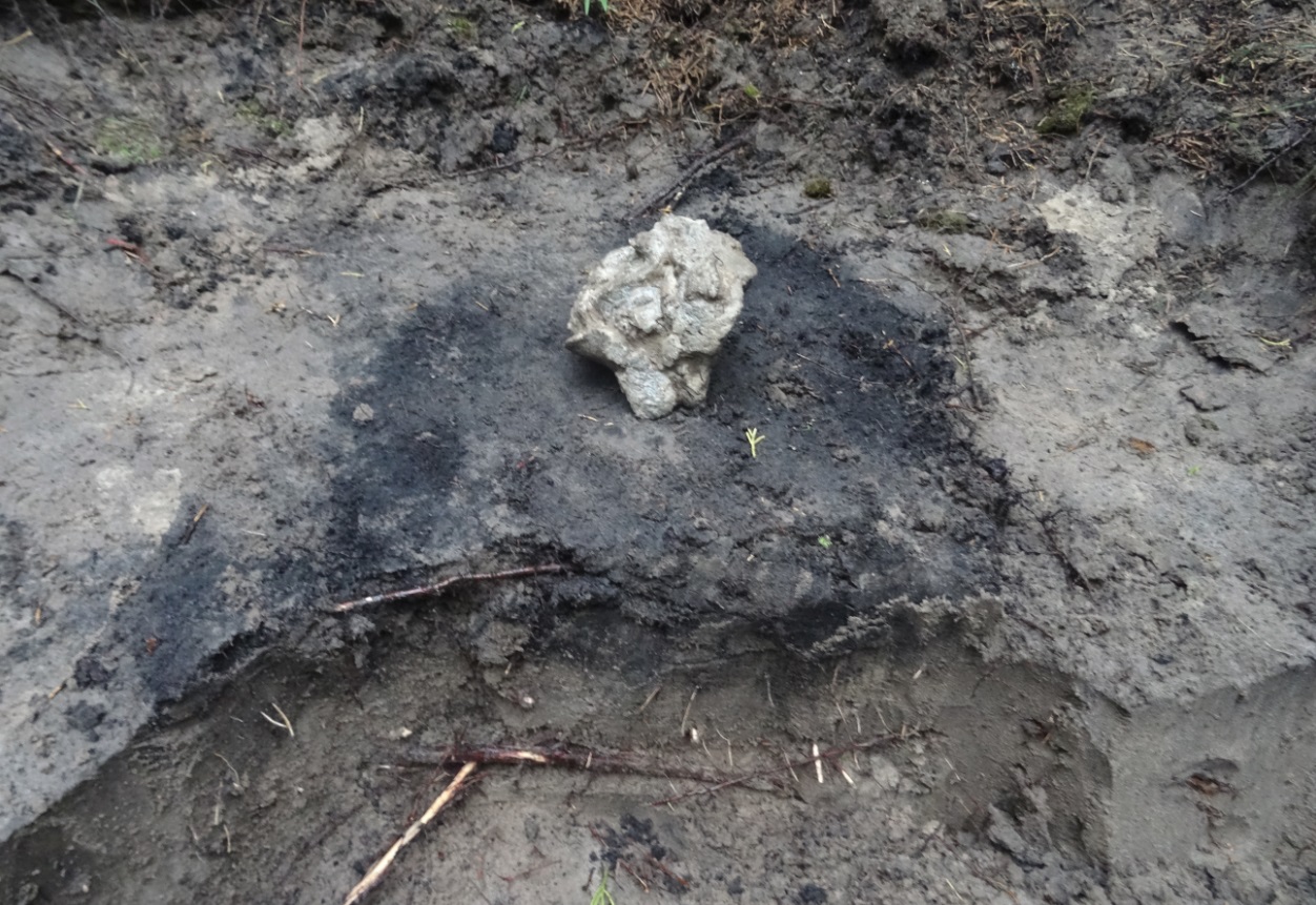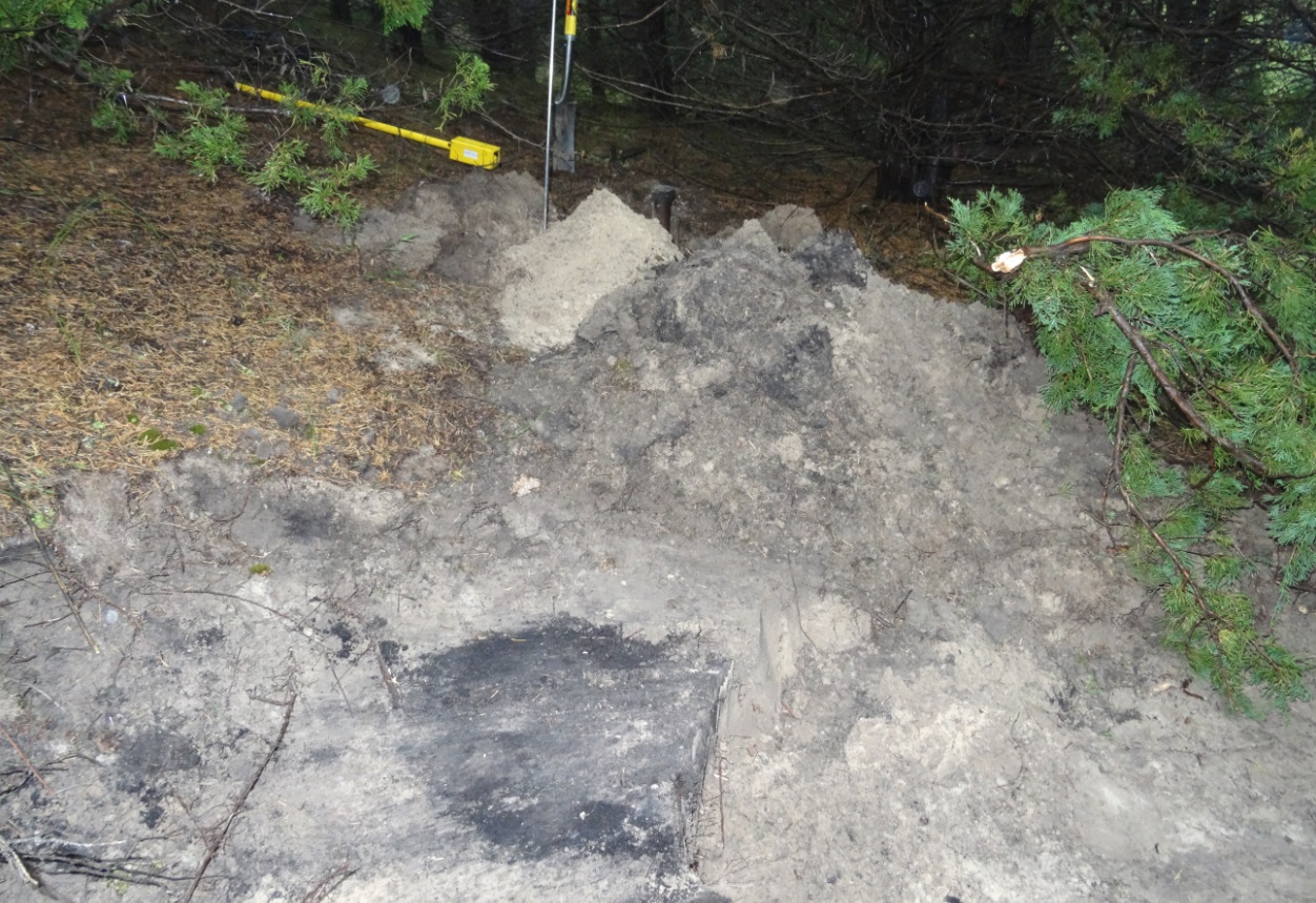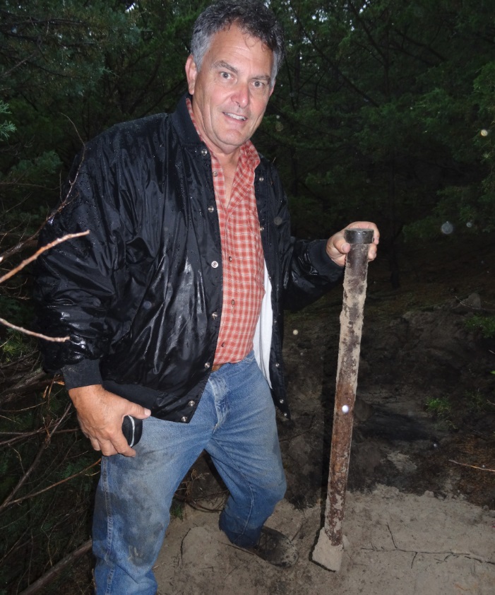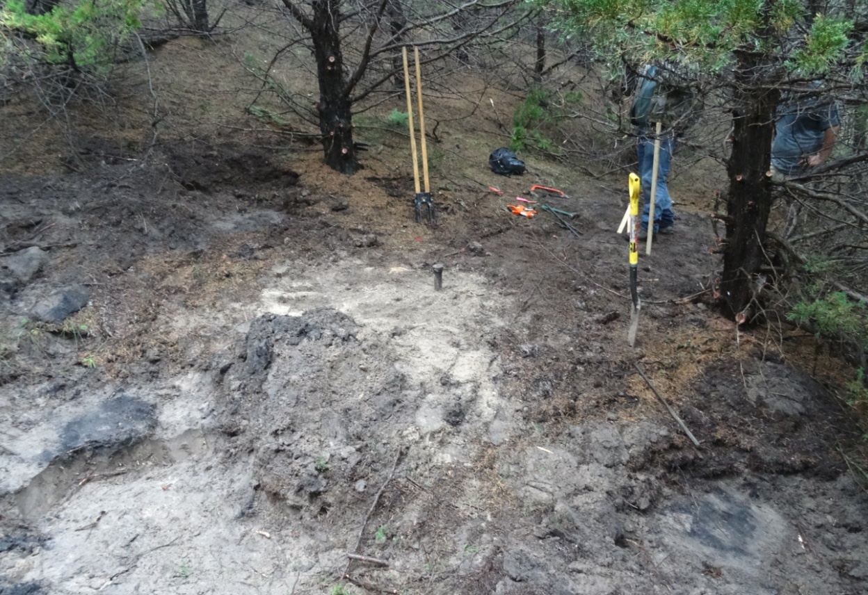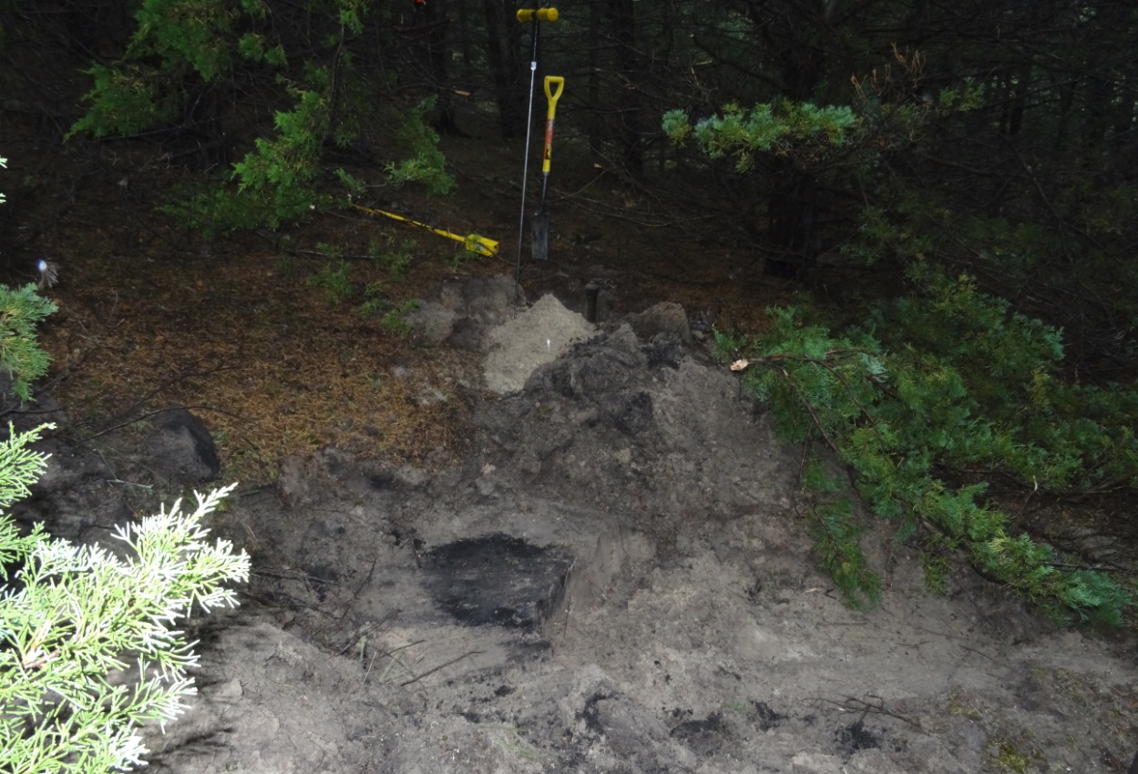 Found a standard GLO brass cap and iron pipe on the north slope of a hill under cedar trees. Tied out the corner and removed the pipe where we found a chunk of concrete about the size of a softball. Replaced the pipe and concrete in their original position and shaved for the pits. Found all four pits which were approximately 18 inches square. We drove a 5/8” rebar in center of each pit.