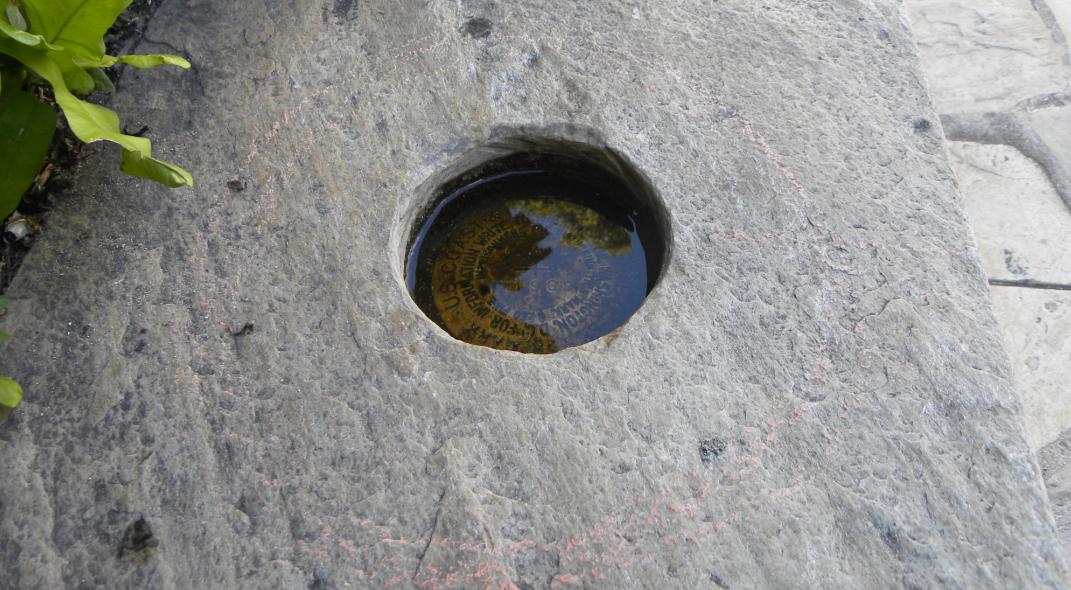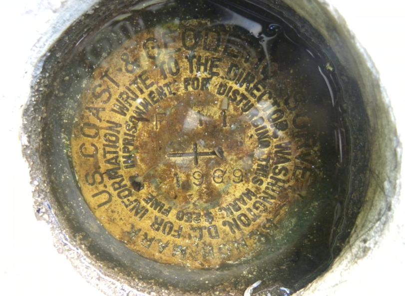 Top view of the bench mark. Water pools up in the hole due to a tight seal around the marker.