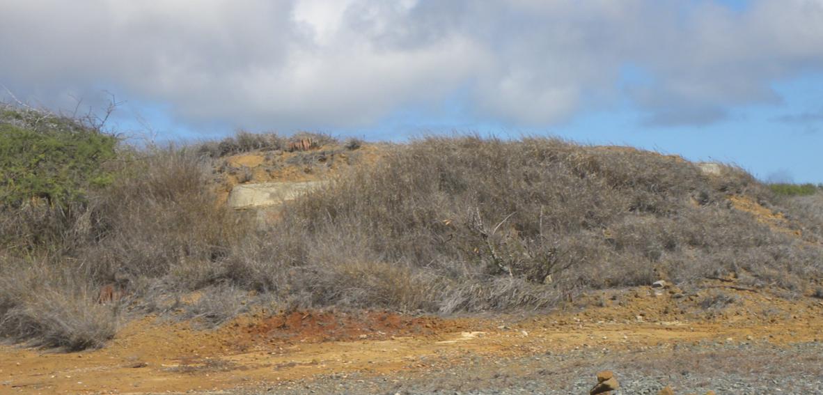 The top of the WWII bunker is barely visible. Dirt has been piled up around the openings.