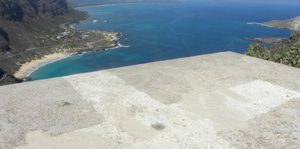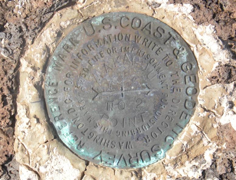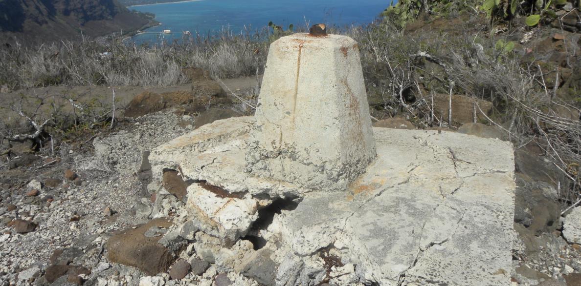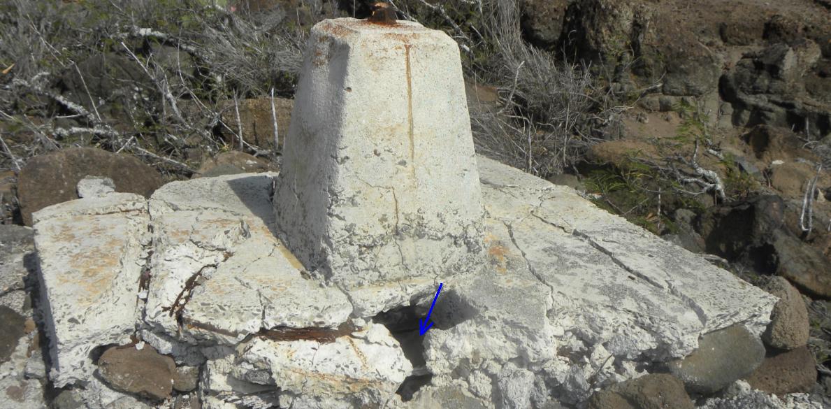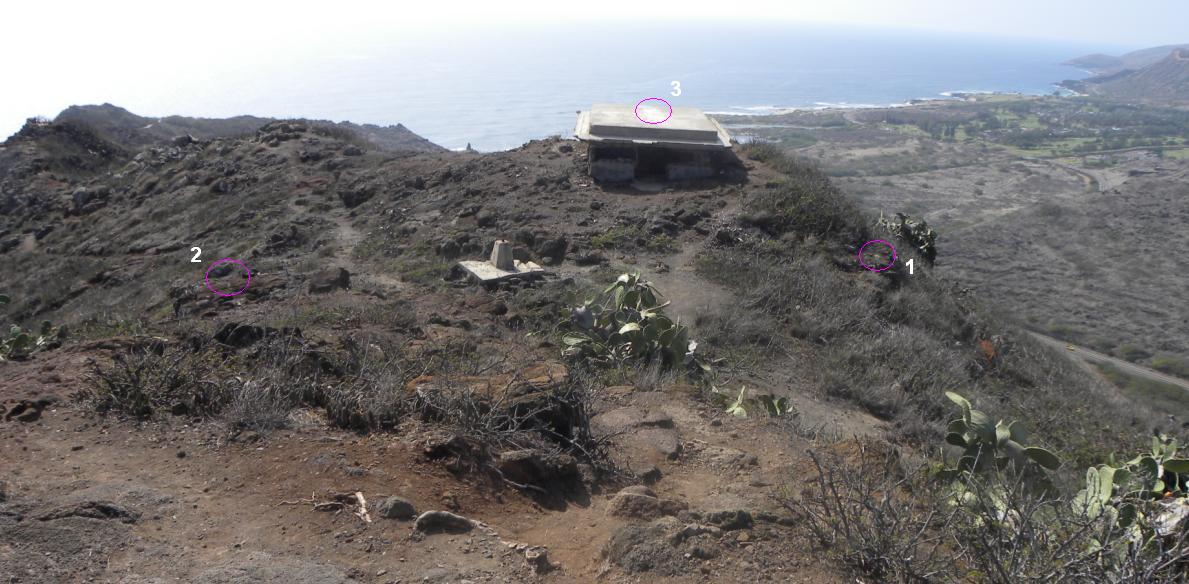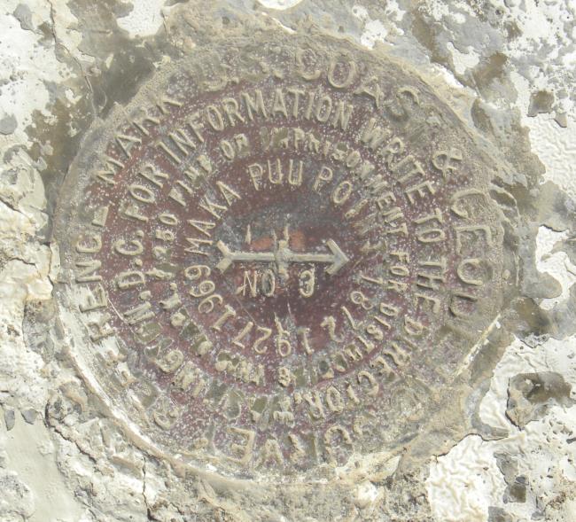 This point is located on the southeast coast of Oahu, Hawaii. An early marker at this location which was set in 1872, consisted of an iron bolt set in the rock and with a cairn of stones. In 1927, the station was remarked by USC&GS with a standard bronze disk in a mass of concrete that was placed over the bolt. Reference marks No. 1 and No. 2 were also placed at this time by USC&GS.In Augsut of 1929, the Hawaii Territory Survey built a "Type A" structure over the bronze disk. In January of 1942, during WWII, it is believed the U. S. Engineers removed the "Type A" structure during construction of several nearby concrete observation bunkers on the same hill. The bronze disk marker, however, survived and was found intact later in 1942. A new concrete "Type B" monument and signal pipe were set over disk by the U. S. Engineers while under supervision of the Hawaii Territory Survey. In 1969, Reference Mark No. 3 was placed on the roof of one of the WWII bunkers.