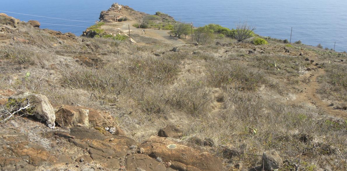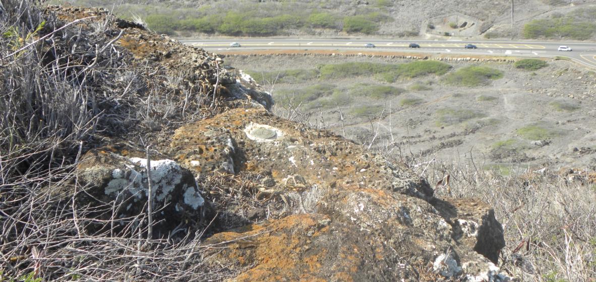 The location is a popular hiking area which is easily accessed from a long hike up a winding asphalt trail from a parking lot along Highway xx. This trail goes to a lookout area over the ocean and the historic Makapuu Point lighthouse. The survey markers are on another ridge that requires some off trail hiking. The "Type B" structure is badly weathered and starting to fall apart. Through an opening at the bottom of the structure you can reach inside and removed the debris to uncover the bronze disk. The "Type B" concrete structure likely once had a signal pole with the red and white vanes, but this was nowhere to be found. All three reference marks were found in very good condition. The WWII bunkers are easily accessible, but have fallen victim to age and graffiti.