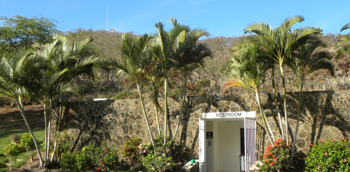 The building is the restrooms at the west side of the Punchbowl National Cemetery below the ridge where the survey marker is located.