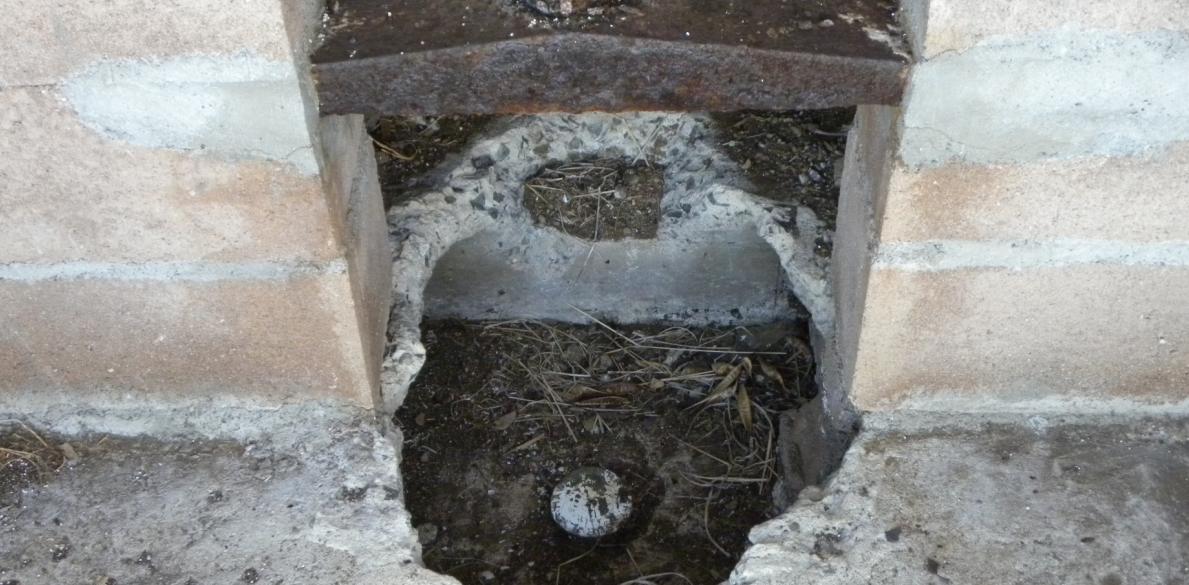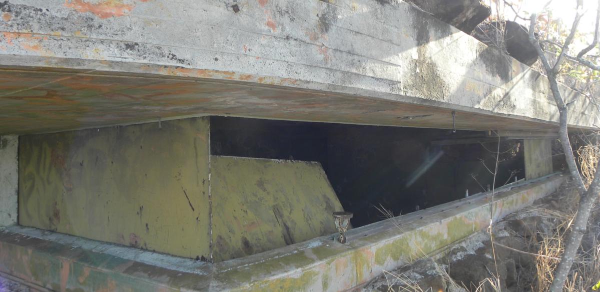 The open front of the structure showing the bottom of the signal pole in the steel yoke over the marker.