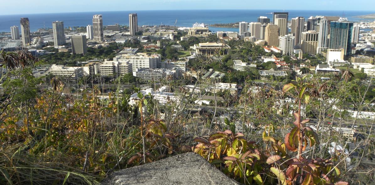 Jenny on the roof of the structure with Honolulu in the background. Looking west.