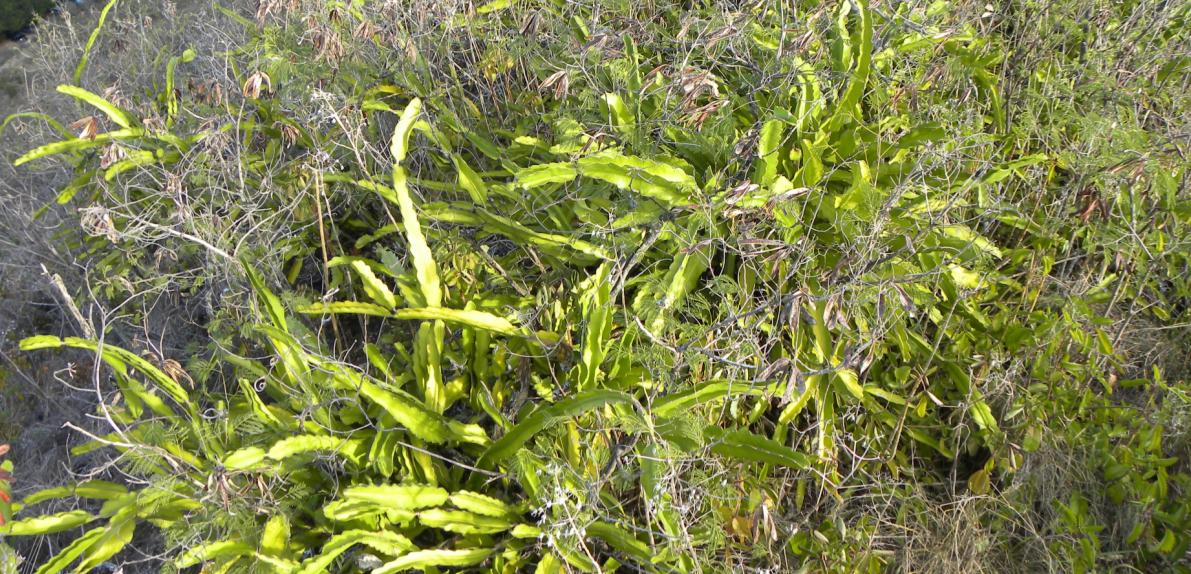 View of the marker location from the ridge while looking north. The green vegetation is cactus.