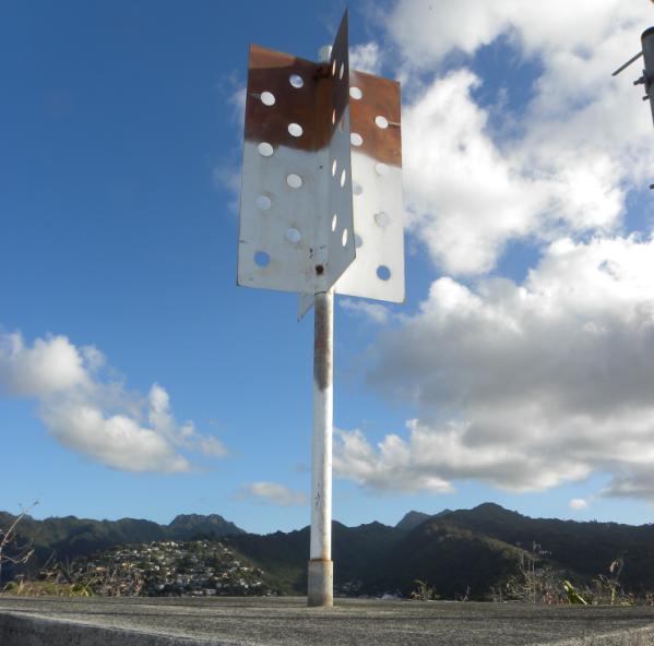 The location for "Punchbowl Reset" is along the west rim of the highest point of the crater for the Punchbowl National Cemetery. An earlier mark existed at this location that was established in 1928-29, but was apparently removed during WWII with the construction of a concrete lookout bunker at the same location. In 1942, the present mark was established by the U. S. Engineers under supervision of the Hawaii Territory Survey. The station is marked with a bronze Hawaii Territory Survey disk.   A "Type B" structure was said to have been built at this location and then later replaced with a "Type A" structure as reported in the recovery report of 1970. The walls of the structure are modern concrete blocks. On top of the walls is a 6-foot square concrete pad for the roof with the hole in the center for the signal pole with the red/white vanes. The backside of the structure houses electronics for an antenna that is affixed to the corner of the structure. The door to the backside has fallen off. Reference Mark No. 1 was found. Due to the large amount of tall cactus, the other two reference marks were not searched for.The WWII concrete lookout bunker still exists and can be easily viewed on the inside and outside. The easiest way to reach the monument is to go to the location below the rim where the cemetery bathrooms are located. A trail had been previously cut through the brush that leads to the crater rim and to the monument. One curious item scattered about on the slope of the rim are numerous shells from large snails that have died. Some of these shells are close to 4 inches in length.