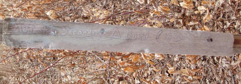 A wooden board found nailed to a post. It appears to have been once painted and the faint outline of the letters were penciled to reveal the wording.