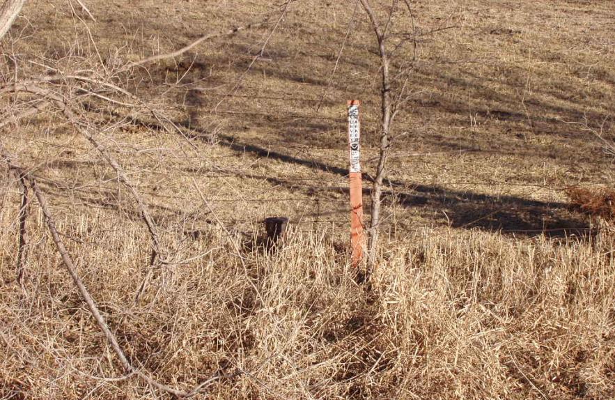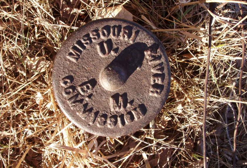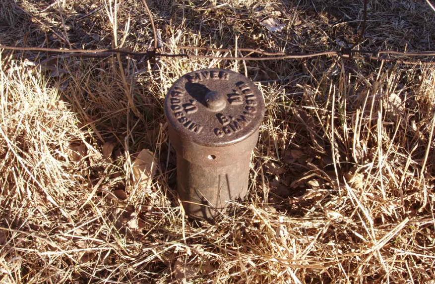 One of the Permanent Bench Marks that was placed along the railroad between St. Joseph, Missouri, and Sioux City, Iowa, in 1892. This bench mark is located approximately 1 mile north of Modale, Iowa, along the east side of the Union Pacific Railroad. Recovered by Gene Thomsen and Jerry Penry.