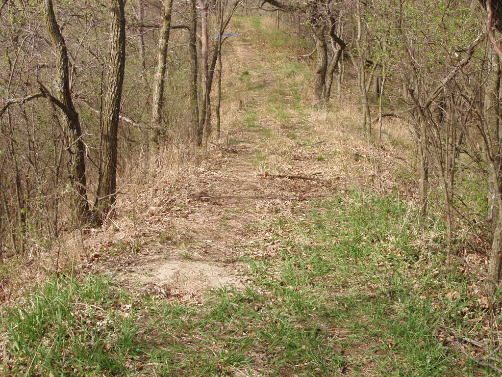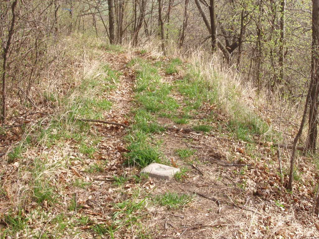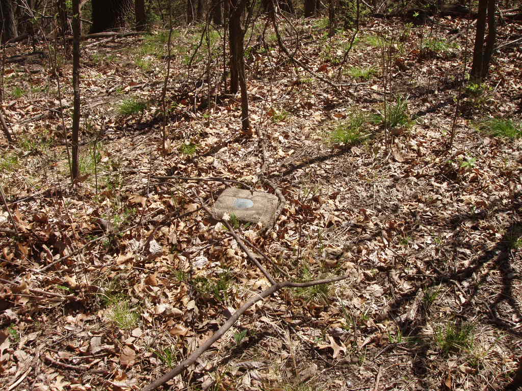 To locate the monument named "St. Deroin", Nebraska surveyors Gene Thomsen and Jerry Penry made a brief search on May 20, 2005, while looking for other old survey monuments in southeast Nebraska. The St. Deroin location is in a remote area along the west side of the Missouri River about 12 miles southeast of Brownville, Nebraska, and in Indian Cave State Park which is operated by the Nebraska Game & Parks Commission. Since most of the area in the state park is only accessible by trails, the St. Deroin triangulation station was hoped to have been found undisturbed. The United States Coast & Geodetic Survey (USC&GS) had remonumented this station in 1947. During the 1947 remonumentation of southeast Nebraska triangulation stations, USC&GS had removed some the 1880's MORC cast caps from the pipes (or already found them missing) and cemented their own brass disk into the top of the pipe. This provided a more secure monument since people had been taking the 1880's caps as souvenirs. However, according to the 1947 datasheet, USC&GS had left the original MORC cap in place on the St. Deroin monument. Perhaps it was thought that no one other than a surveyor would ever venture to that remote site on private property since it was before the area was made into a state park in 1962. During the 1947 remonumentation of the St. Deroin marker, two reference marks and an azimuth mark were set by USC&GS.When we, Gene and Jerry, first arrived in May of 2005 it was obvious that the 10-foot wide ridge where the monument resided had been converted to a hiking trail. USC&GS Reference Mark No. 2 appeared to have been struck by a piece of machinery such as a mower while Reference Mark No. 1 was found undisturbed. The MORC St. Deroin triangulation station was nowhere to be found even after using the published USC&GS distances from the two reference marks. It was concluded that the St. Deroin monument had also probably been hit by the mower on the ridge and that a worker had completely removed the "obstacle". A search with a metal locator on the ridge and up and down the nearby steep slopes provided nothing. A probe had not been brought during that initial search since we were confident that we would find at least the pipe still in place even if the cap had been taken. The hot day with temperatures in the upper 90's compounded with an infestation of deer ticks prompted us to decide to return another day for a better search.