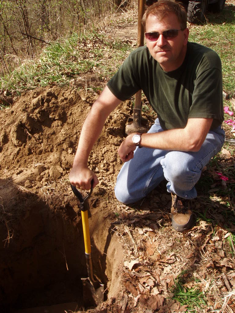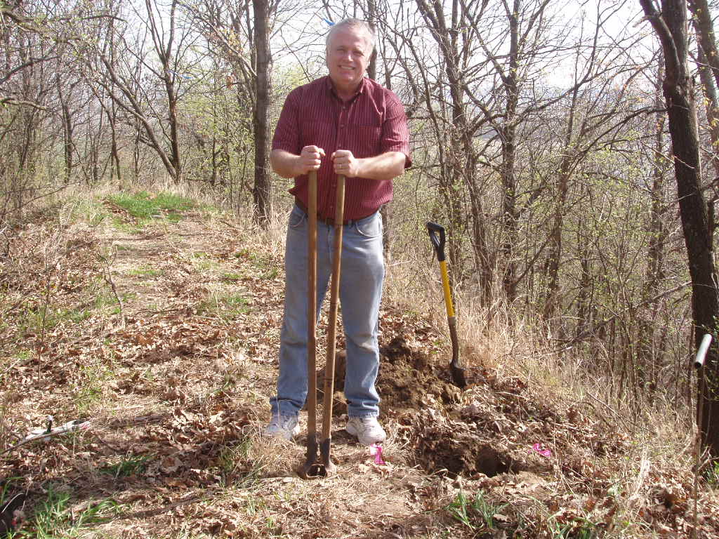 Gene Thomsen takes out the first load of soil after probing found the lower stone.