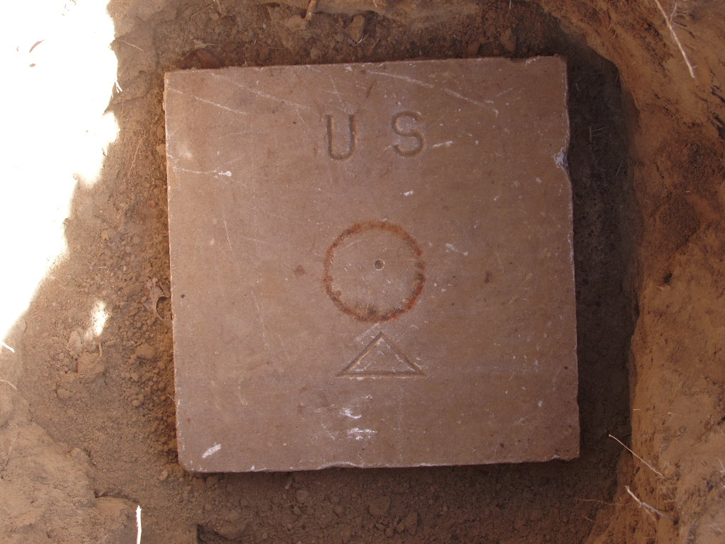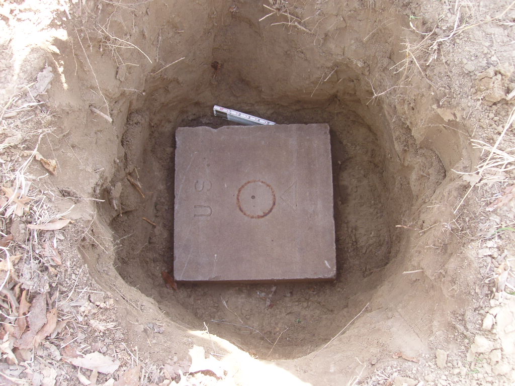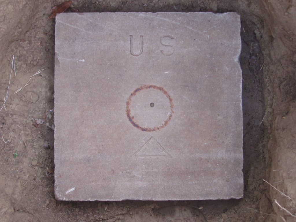 The monuments consisted of a lower 18" square limestone block 4" thick with a drill hole in the center. Centered above the drill hole was a 5" diameter pipe with a 6" diameter cap bolted to the top. In theory the position of the surface monument could still be recovered by digging down to the lower monument if the pipe and cap were removed.
