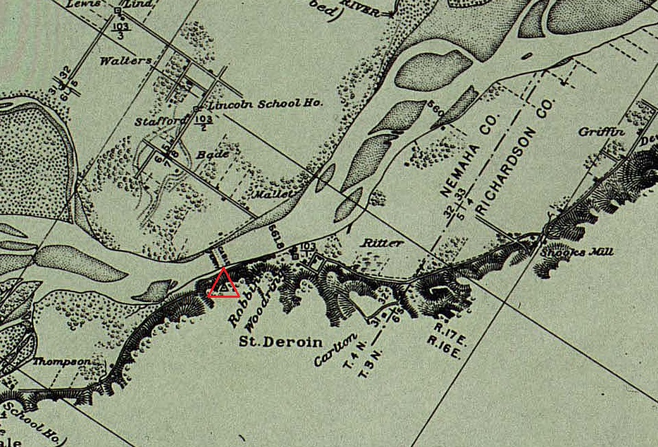 The MORC surveying crews usually named each station for a nearby physical feature or town. When the site for the "St. Deroin" triangulation station was selected, it was naturally named for the nearby river town having that name. The town of St. Deroin was one of Nebraska's oldest communities having been established in 1854. Its name is derived from a half-breed Otoe Indian chief named Joseph Deroin upon whose land the town occupied. A ferry operated at this location, and it would have been a stopping place for many early Missouri River travelers including those of the MORC survey crews. In 1911 the town was destroyed by a Missouri River flood.