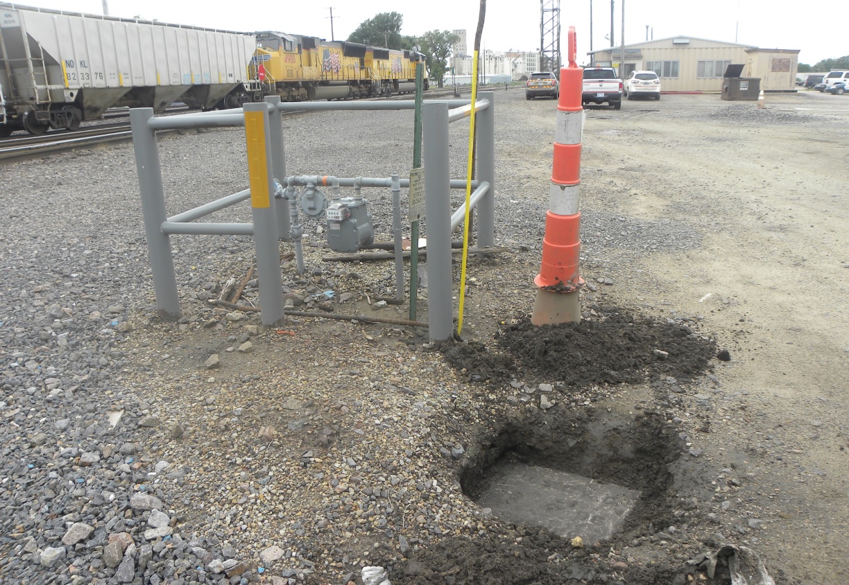 West Base is located at the south end of Front Street and 90 yards south of Forest Avenue. It is approximately 50 yards easterly of the Union Pacific yard office at the west end of the yard. The slightly buried marker is on the northeast corner of a steel pipe protective fence around a gas meter and is approximately 0.8' below the surface. It is not currently being protected. Both monuments were easily recovered by Gene Thomsen and Jerry Penry on August 12, 2016. They are each in very good condition despite their 120-year age. According to the original description, there are six points placed between the end points. A latitude station was once located approximately 25' east of the West Base and was constructed of cement and bricks.