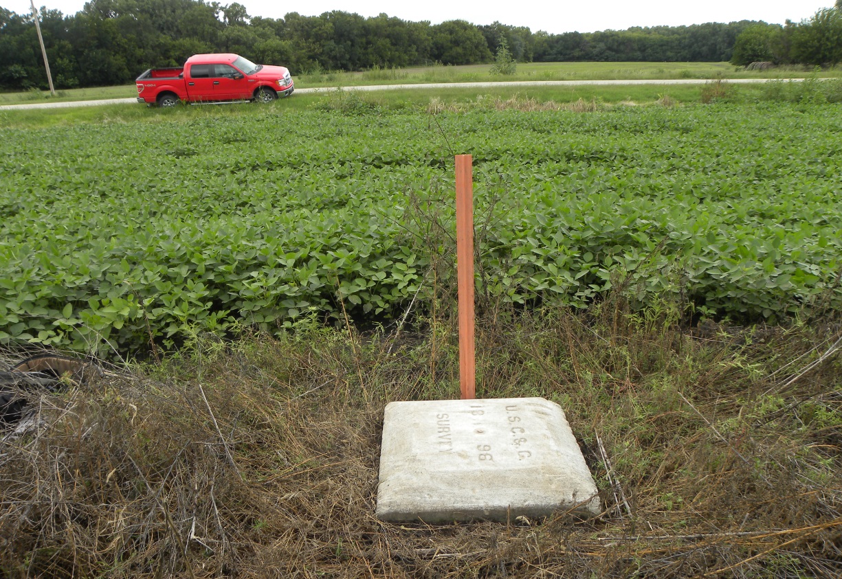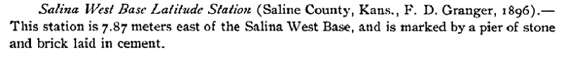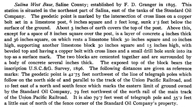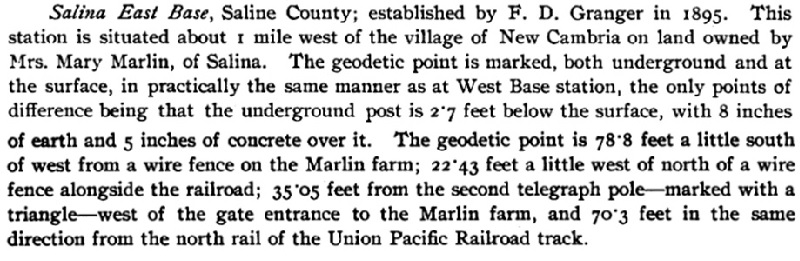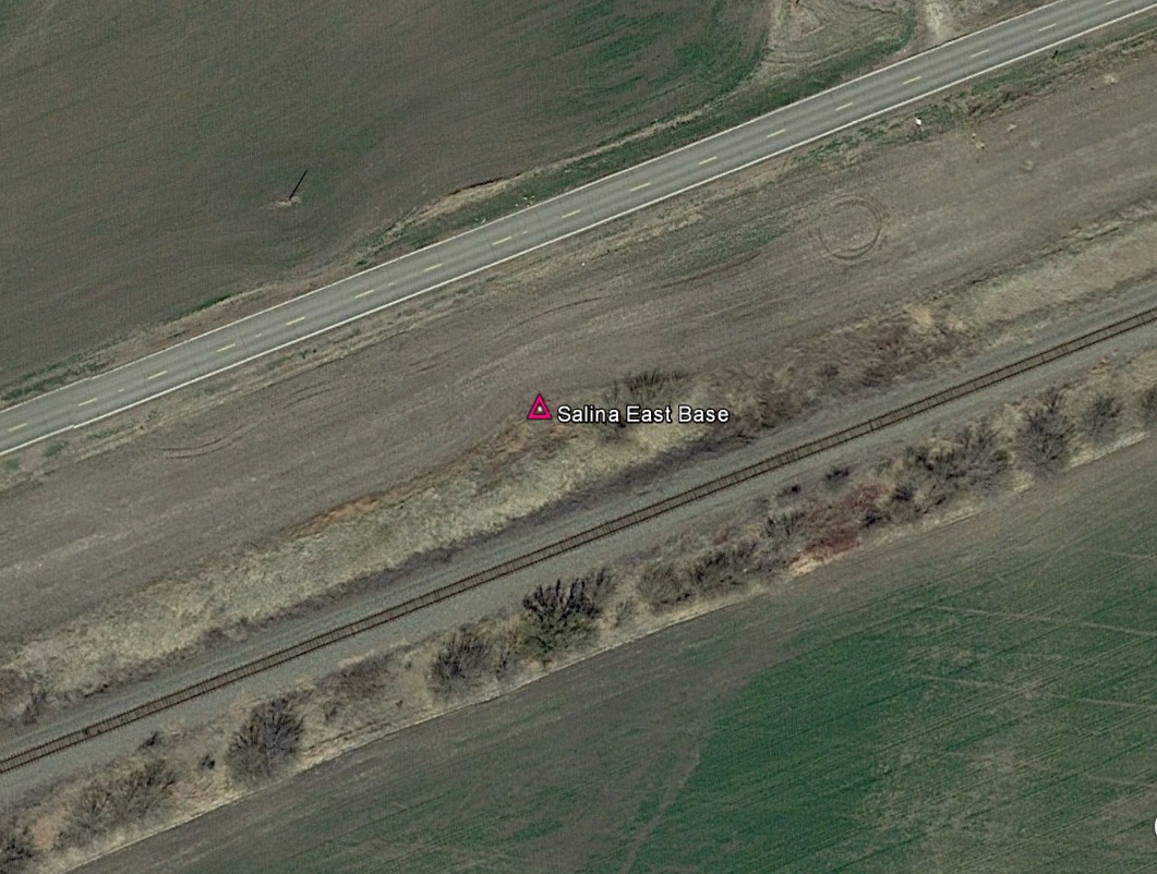 The Salina Base Line, located at Salina, Kansas, was established in 1895 and measured in 1896. It was part of the east-west transcontinental triangulation network across the center of the United States. The end points are 30" square limestone blocks with copper pins in the center.East Base is located 1.3 miles southwest of New Cambria. It is between the Union Pacific Railroad and Old Highway 40, being approximately 30 yards southerly from the highway and 25 yards northerly from the railroad. The surface mark is very visible above the ground surface and can be seen on current Google Earth images. Unfortunately, the only current protection for this monument is a carsonite survey marker post.