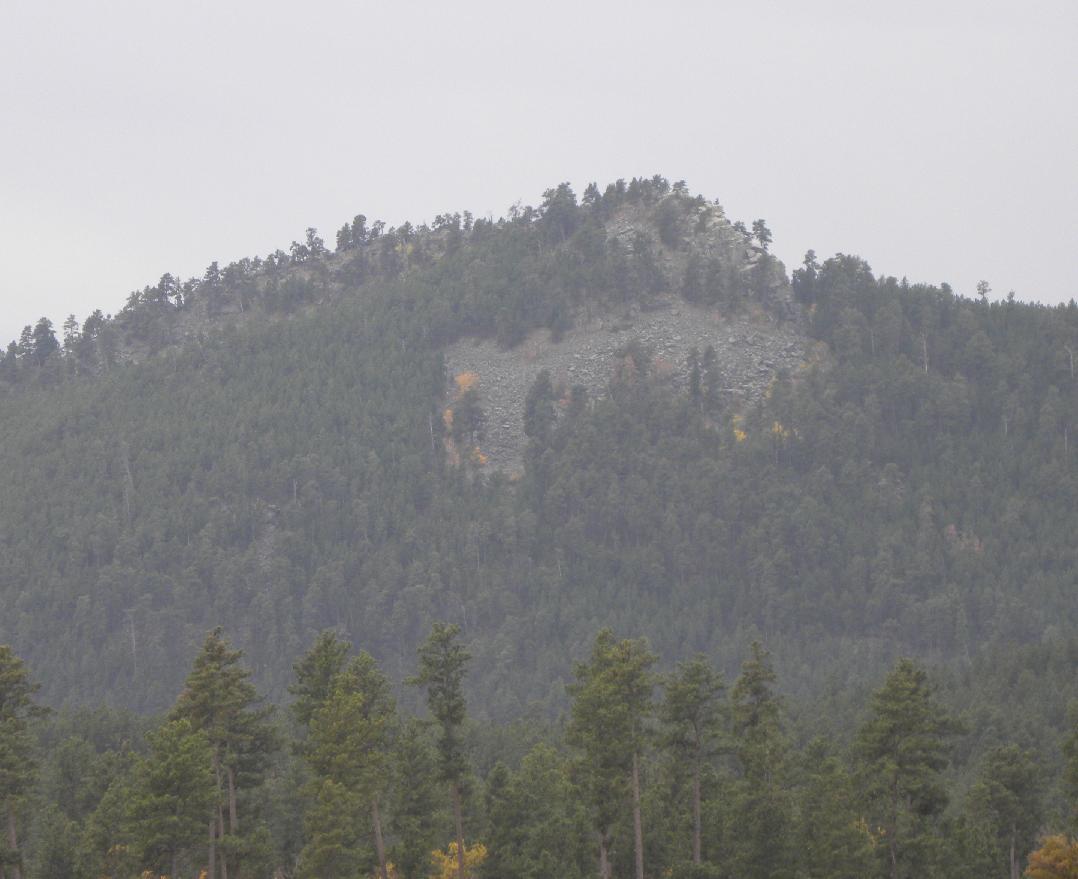 The north side of Boulder Hill through a foggy mist as viewed at a distance of two miles from Sheridan Lake Road.