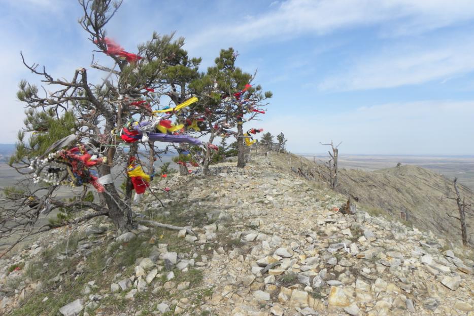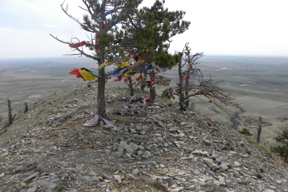 Bear Butte is the location of the northern most triangulation station in the original 1893 U. S. Geological Survey network. Located to the northeast of Sturgis, South Dakota, it is an important landmark and a religious site for Native Americans. In 1961, the area was designated as a state park. Bear Butte is considered sacred to many Native Americans who make pilgrimages to leave prayer cloths and bundles tied to trees along the trails and at the top of the mountain. It is considered a place of prayer, meditation, and peace. The peak rises over 1,250 feet above the surrounding plain.The mountain has undoubtedly had many notable visitors including Chiefs Red Cloud, Crazy Horse, and Sitting Bull. General Custer visited the area in 1874. Earlier in 1857, it was the site for a gathering of many Indian nations to discuss the growing presence of white settlers in the Black Hills.