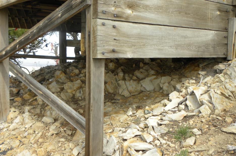 Jerry Penry underneath the observation platform on the top of Bear Butte to get a photo of the 1925 capped iron pipe known as "Bear".