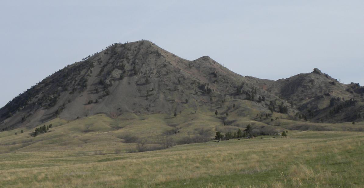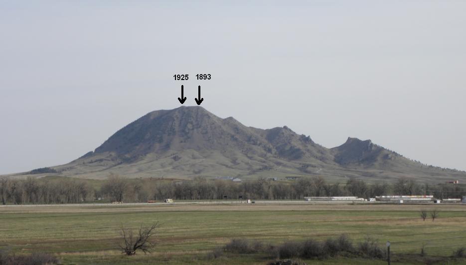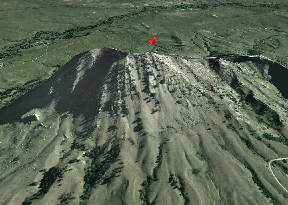 Oblique view of Bear Butte looking northeasterly. The red pushpin is the location of the original 1893 USGS triangulation station.