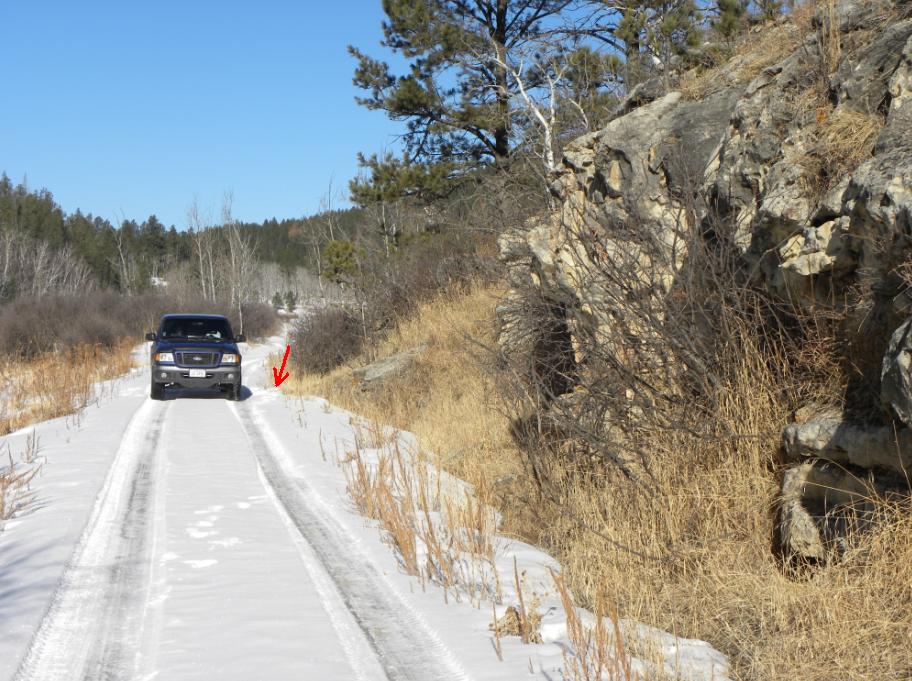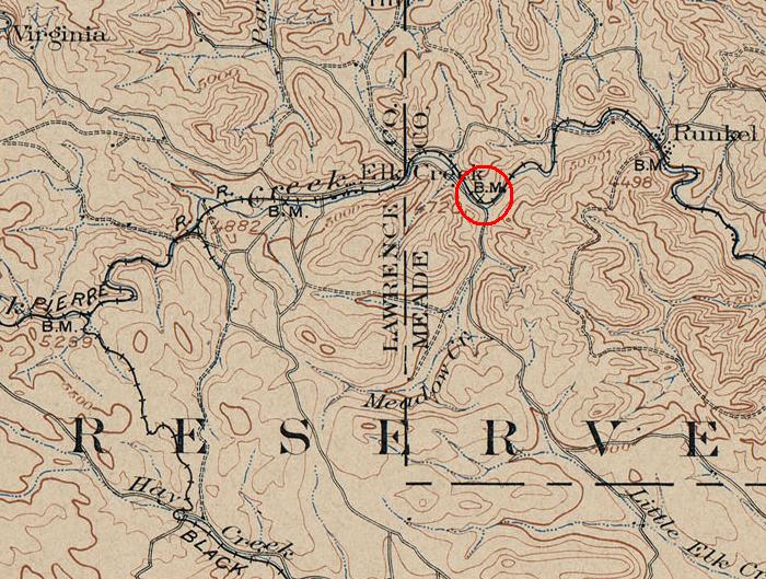 This bench mark is a good example of a USGS copper bolt used in the late 1890's. The original description stated it was located at a place known as Mowatts Siding along the Black Hills & Fort Pierre narrow gauge railroad through Elk Creek Canyon. It was set ten feet north of the tracks. This railroad was completely washed out during a flood in 1907 and never rebuilt. Today the grade is used as driveway to an acreage located further west. The ghost town of Runkel was once located approximately 2 miles to the east. The city of Sturgis is located approximately 7 miles north-northeast of the bench mark. Recovered by Jerry Penry and Jenny Stukel.