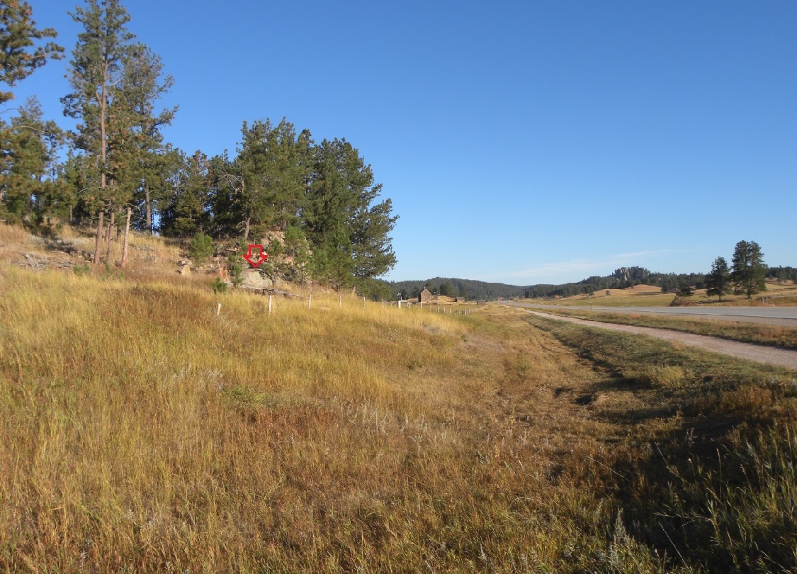 The arrow marks the location of the bench mark. The former railroad grade, now Mickelson Trail, and Highway 385 are at right.