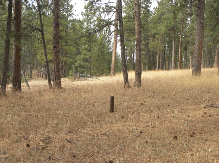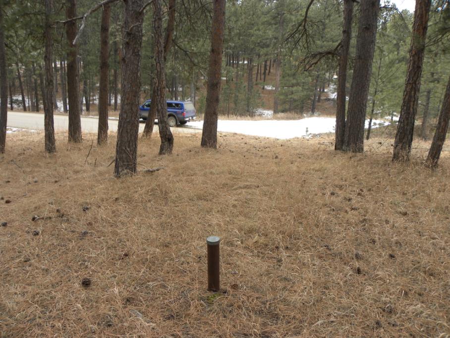 This iron post bench mark is located approximately 2 miles south of the former town of Pactola which is now under Pactola Reservoir. It is approximately 13 miles west of Rapid City. The bench mark was set well away from the trail, so it was preserved when the trail was widened into a paved road. Recovered by Jerry Penry and Jenny Stukel.