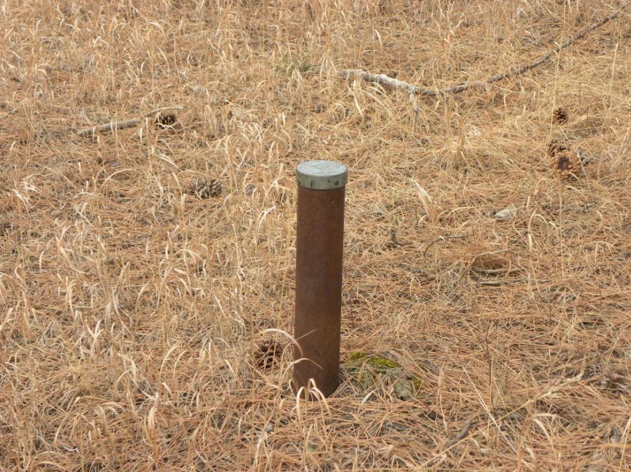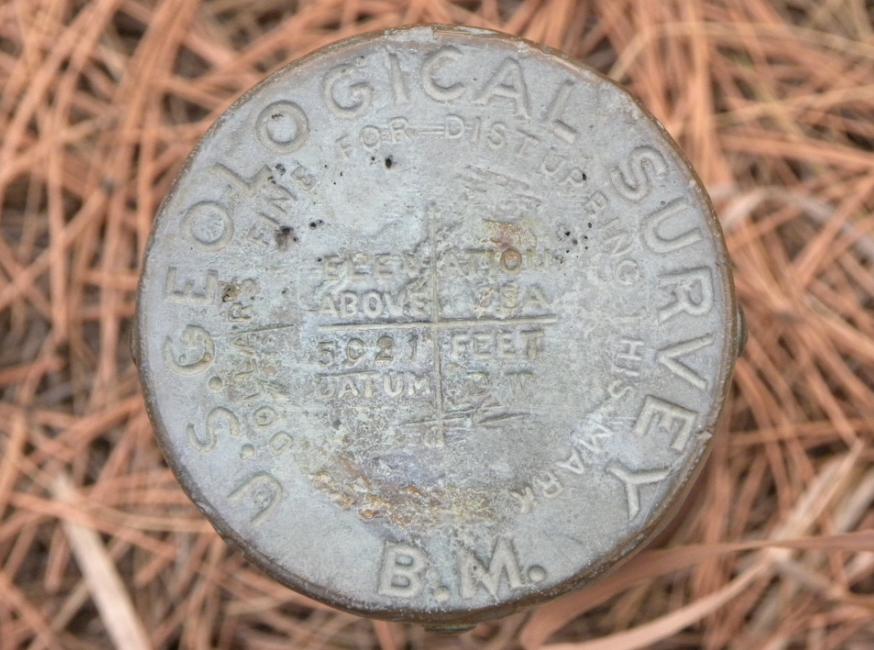 The iron post bench mark surrounded by pine needles and pine cones.