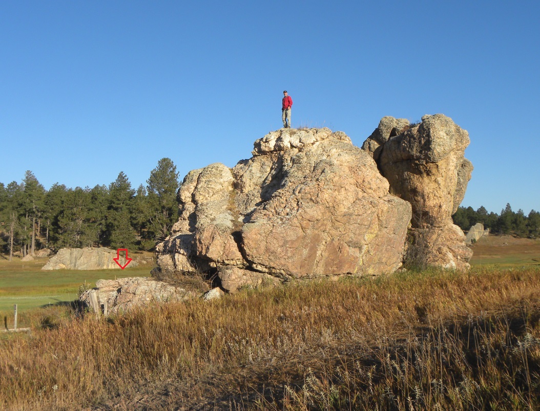 Kurt Luebke on the rock with the arrow pointing to the location of the bench mark.