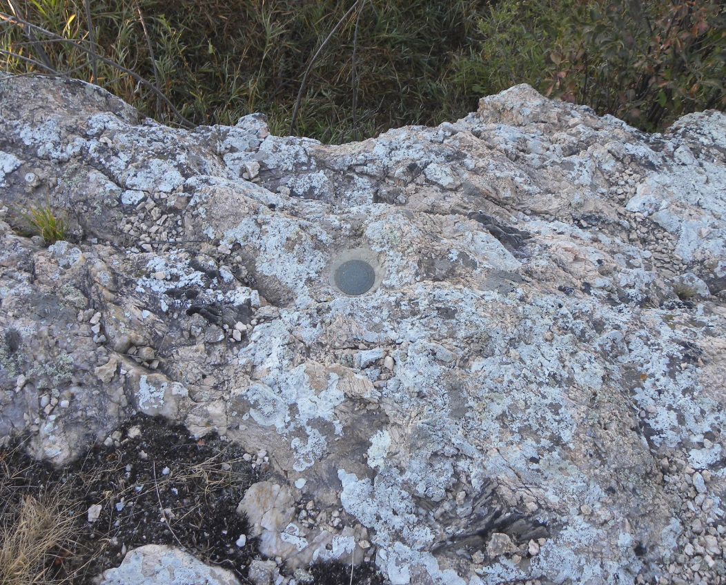 Close up of the bronze disk cemented into the drill hole where the original USGS copper bolt was once located.