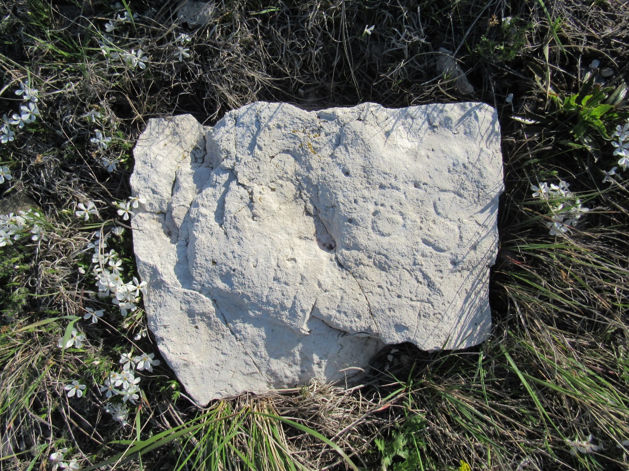 Weather has damaged the top of the stone monument, but the letters "G S" are still very visible on the right side.